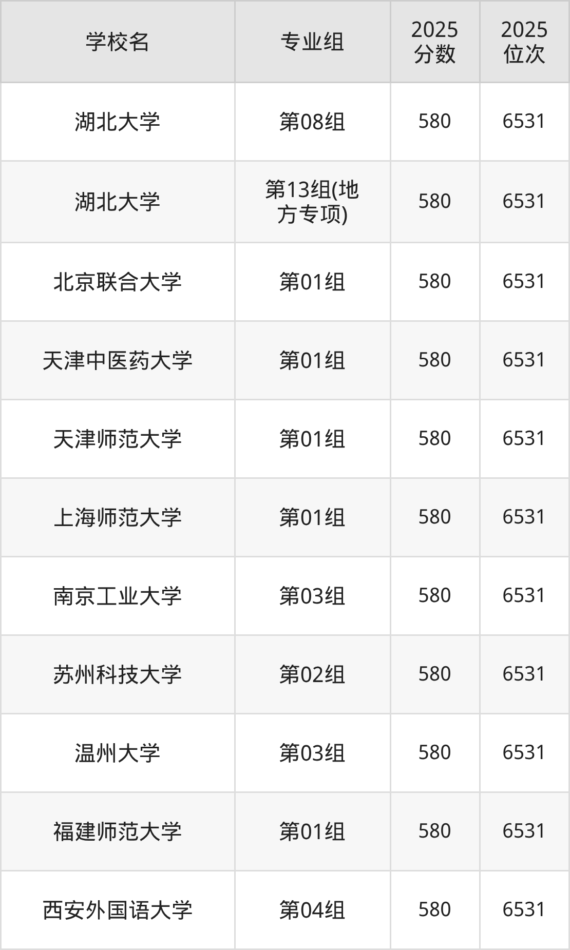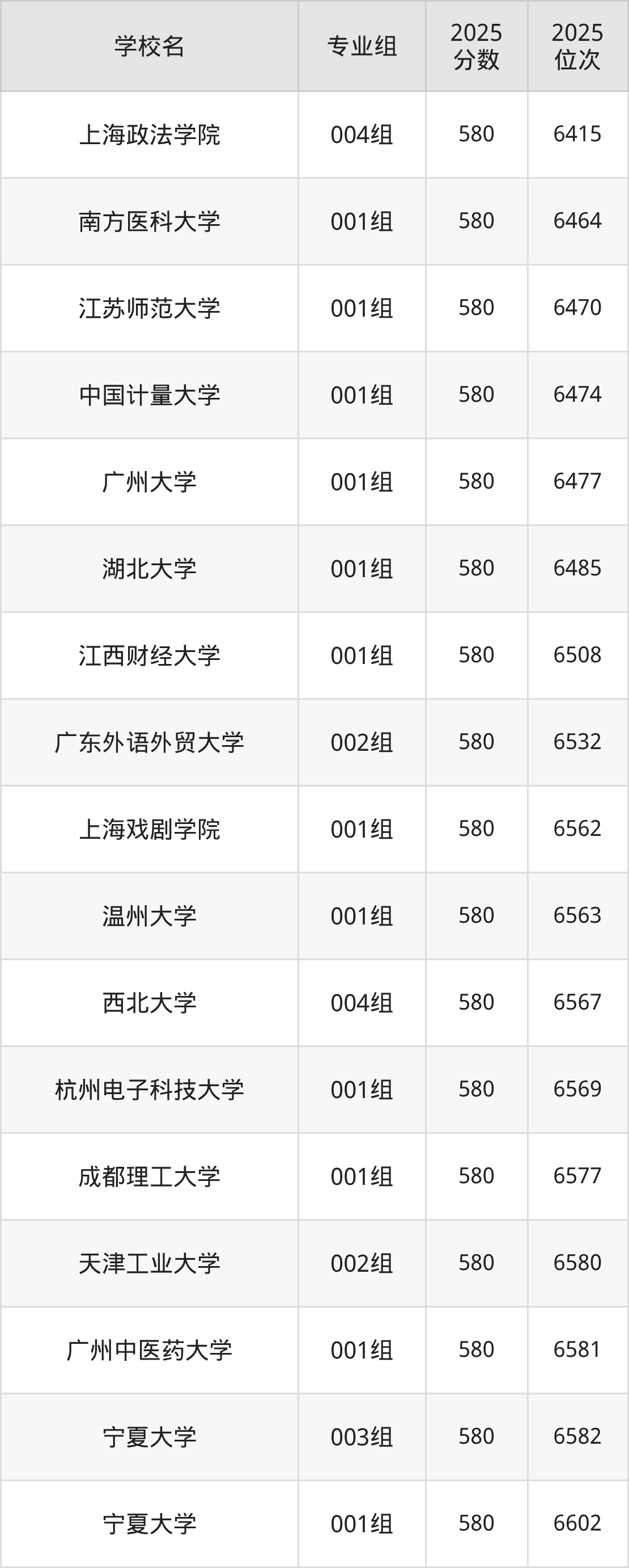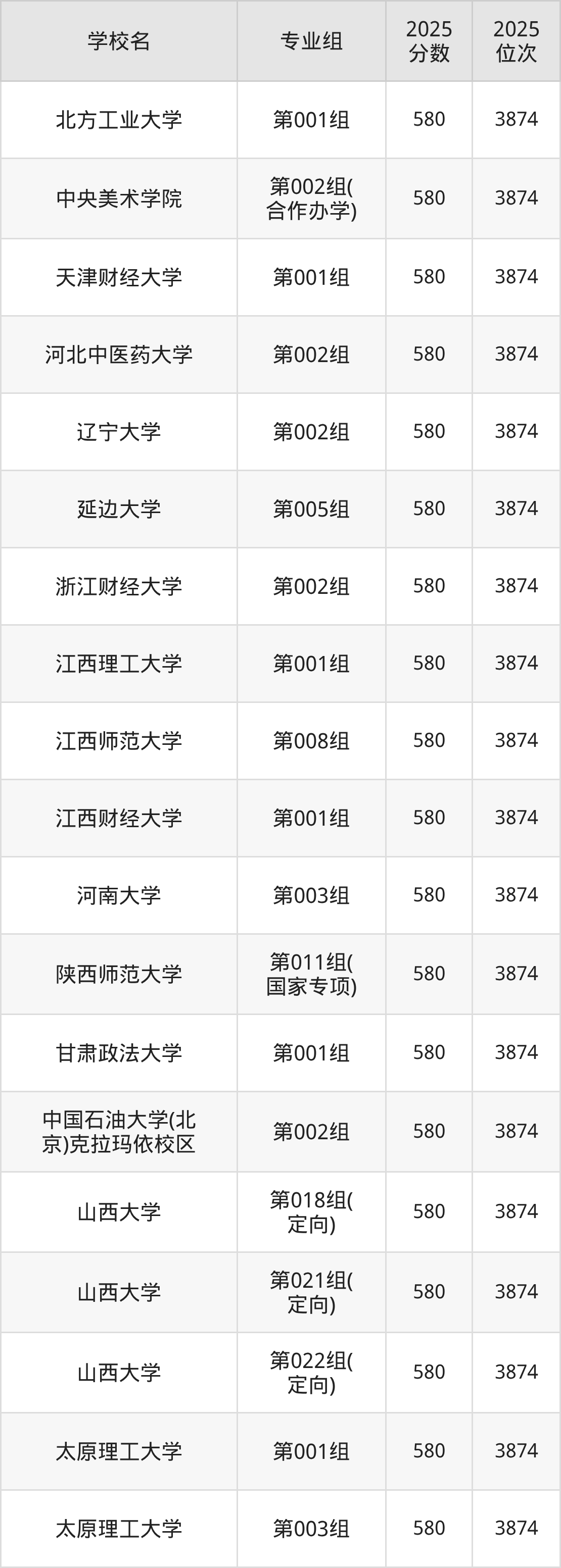 2025年山西历史类本科线是443分,因此对于山西580分考生而言,可以上的大学多数均属于公办。比较好的有211的陕西师范大学第011组(国家专项)、中国石油大学(北京)克拉玛依校区第002组、太原理工大学第001组等,2025年学校最低分是580分。