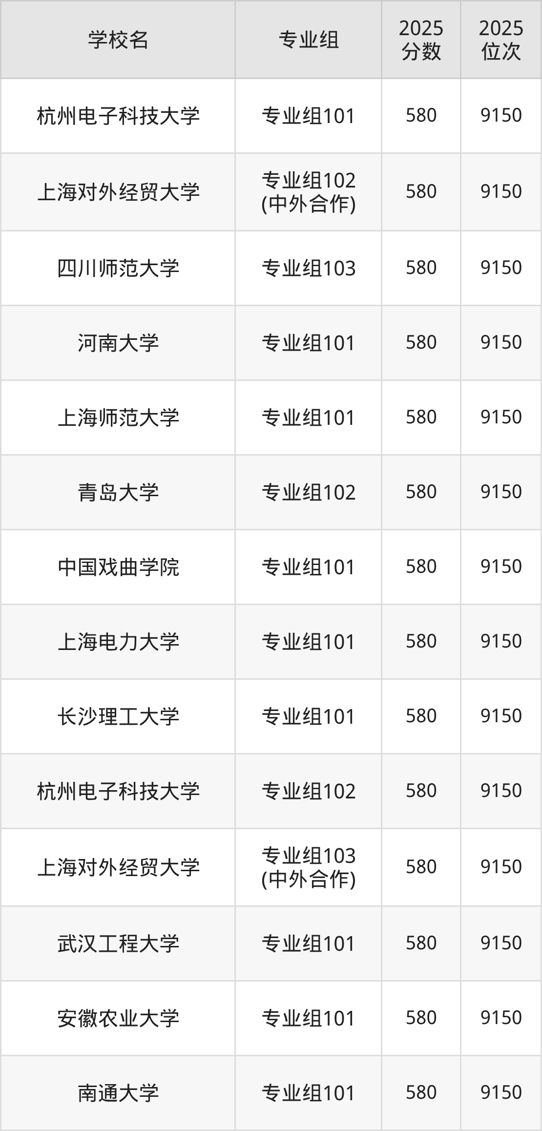 2025年四川历史类本科线是467分,580分考生超本科线113分,能选择的本科大学,多数为公办大学。录取分数线是580分的省重点有杭州电子科技大学专业组101、四川师范大学专业组103、上海师范大学专业组101等。