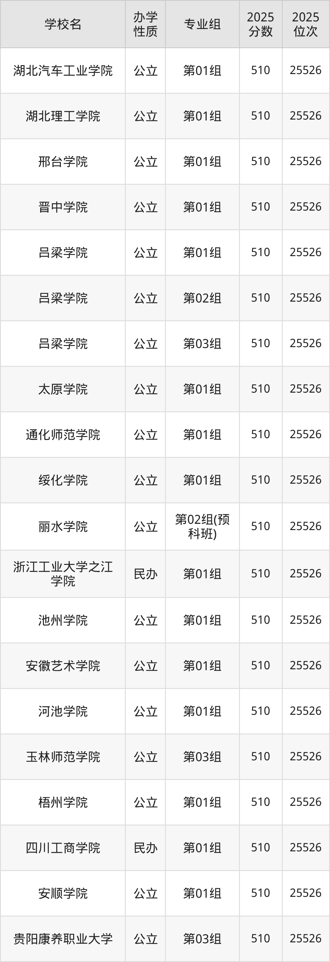2025年湖北历史类本科线为442分,因此对于湖北省510分的文科考生而言,可以选择本科大学。属于公办二本大学的如:湖北汽车工业学院第01组、湖北理工学院第01组、邢台学院第01组等。具体名单如下: