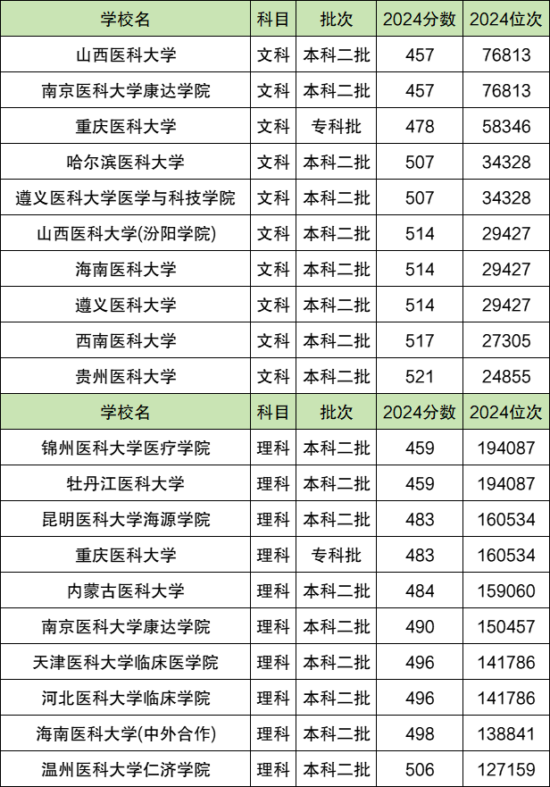 根据各省2024年投档录取数据,为大家整理了全国各省二本医科大学最低分汇总,供查阅。