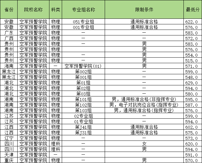 | 空军预警学院 | 物理 | 侦察情报 | 男 | 581 |