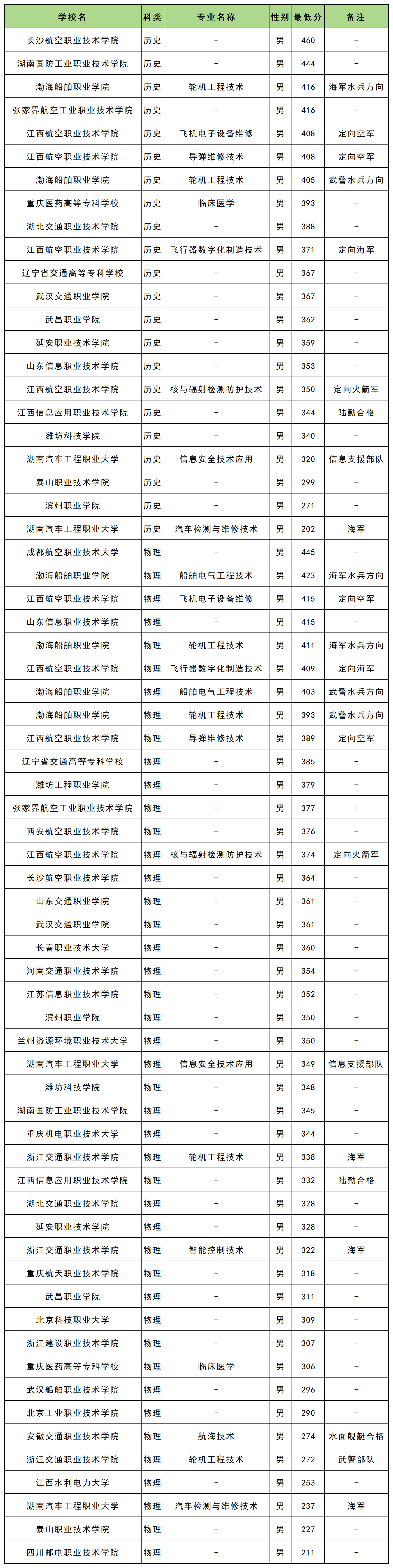 2025年辽宁定向士官历史类最低线是202分,对应收分最低的是湖南汽车工程职业大学的汽车检测与维修技术专业(海军)。