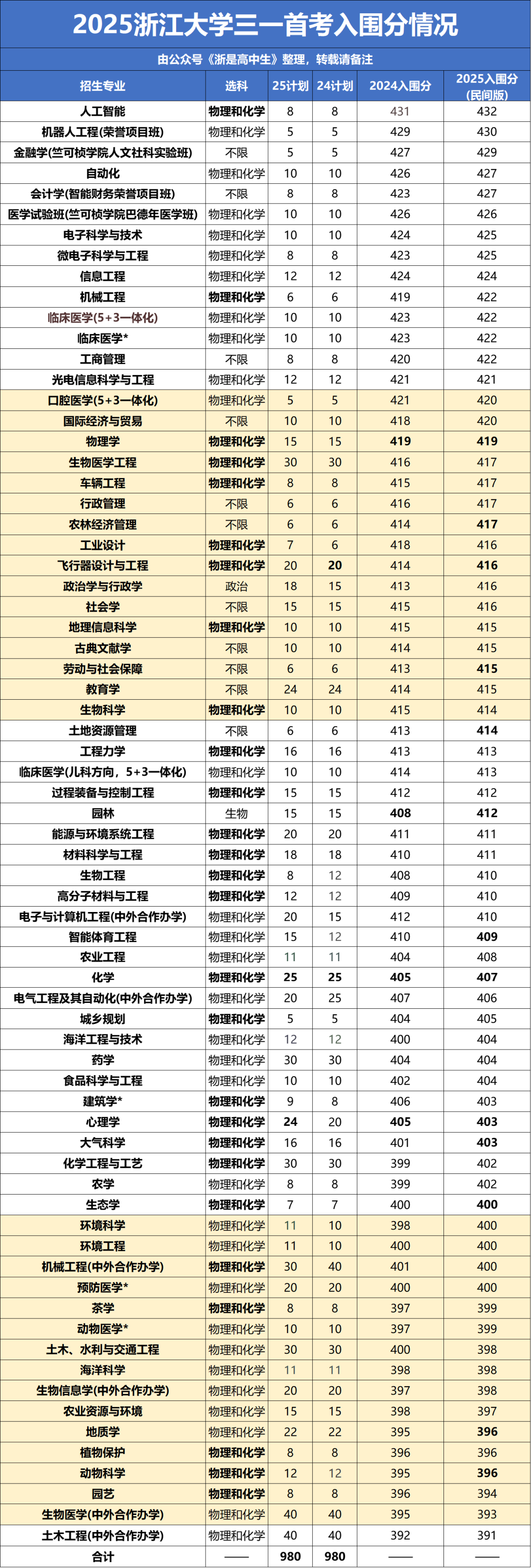 2025年浙大三一最低入围分为391分(土木工程中外合作办学)。本部普通专业最低入围分为394分,对应园艺专业,其次为396分,对应动物科学、地质学、植物保护专业。