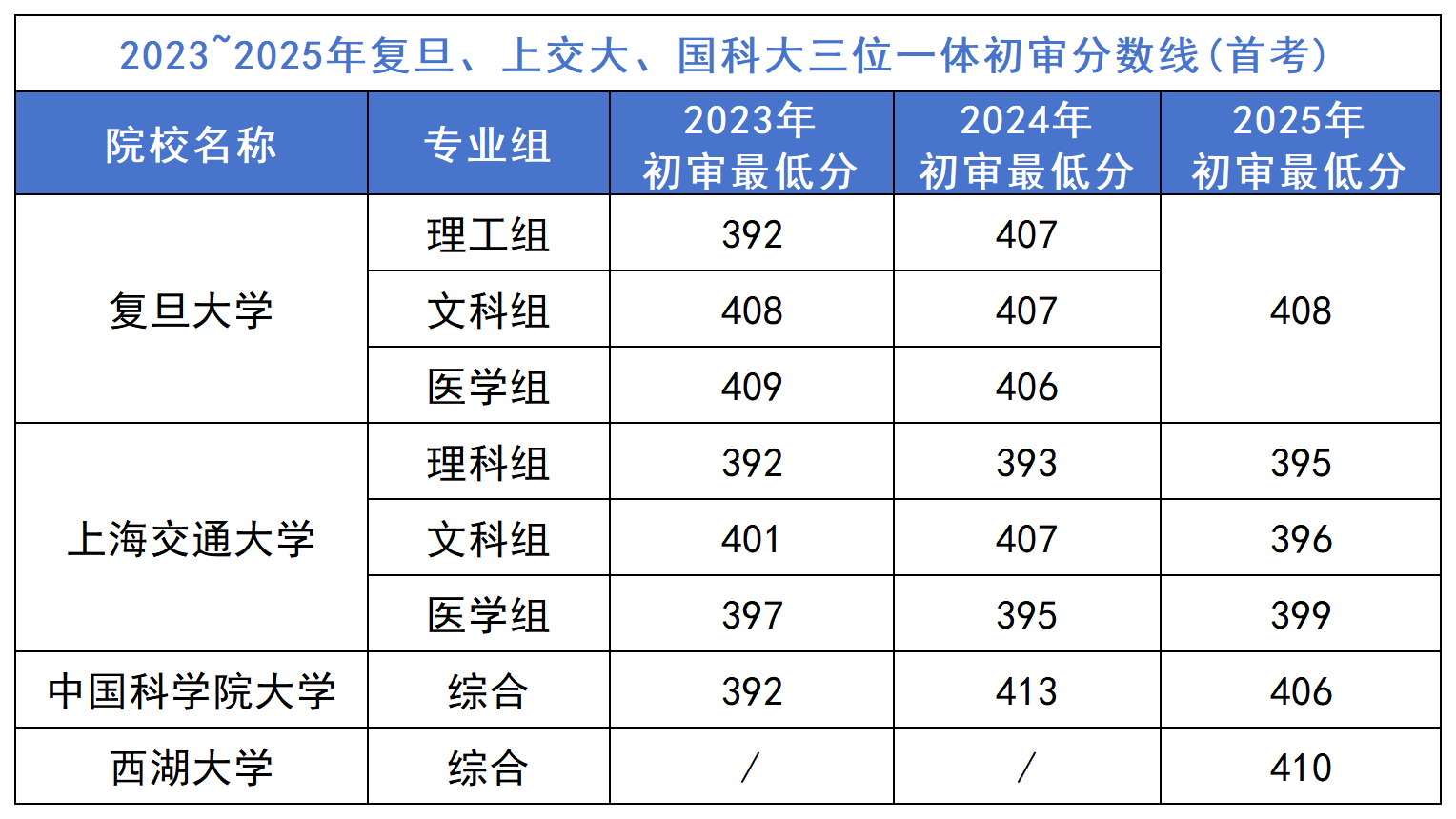 2025年,复旦各专业组初审最低分为408分,国科大为406分,西湖大学为410分。从历年首考入围分数线来看,大多数高水平三一院校的初审底线均在390分以上,王牌专业普遍要求420分以上。