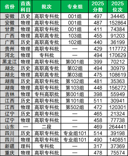 从学校专科批次在各省的录取线来看,其最低分数线基本都在本科线上,对于分数线较低的省市,如广西、贵州,分数最好要超过本科线30分左右。