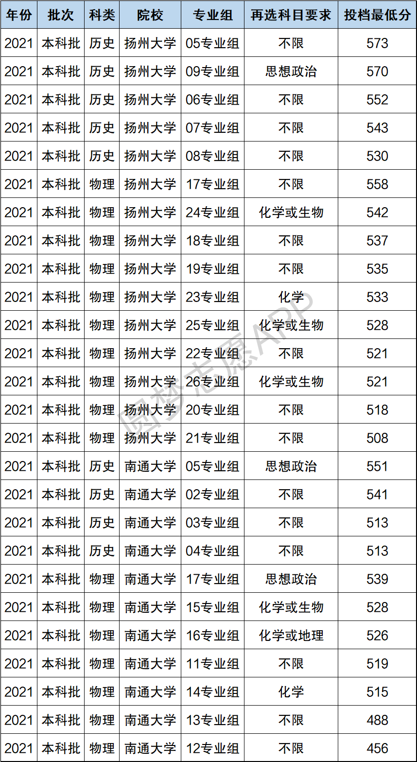 小编整理了2021年扬州大学和南通大学在江苏省各专业组的投档线: