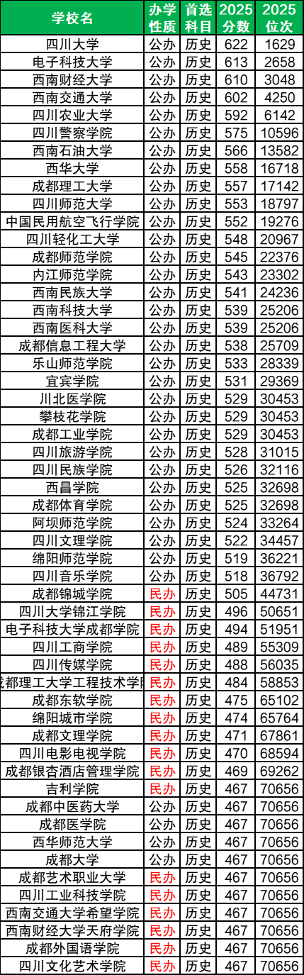 2025年四川所有本科大学历史类最低录取分数范围在467分-622分之间,最低分院校是四川文化艺术学院、成都外国语学院、西南财经大学天府学院、西南交通大学希望学院、四川工业科技学院等,最高分院校是四川大学。结合批次线来看,考生分数达历史类本科线即可上省内本科大学。