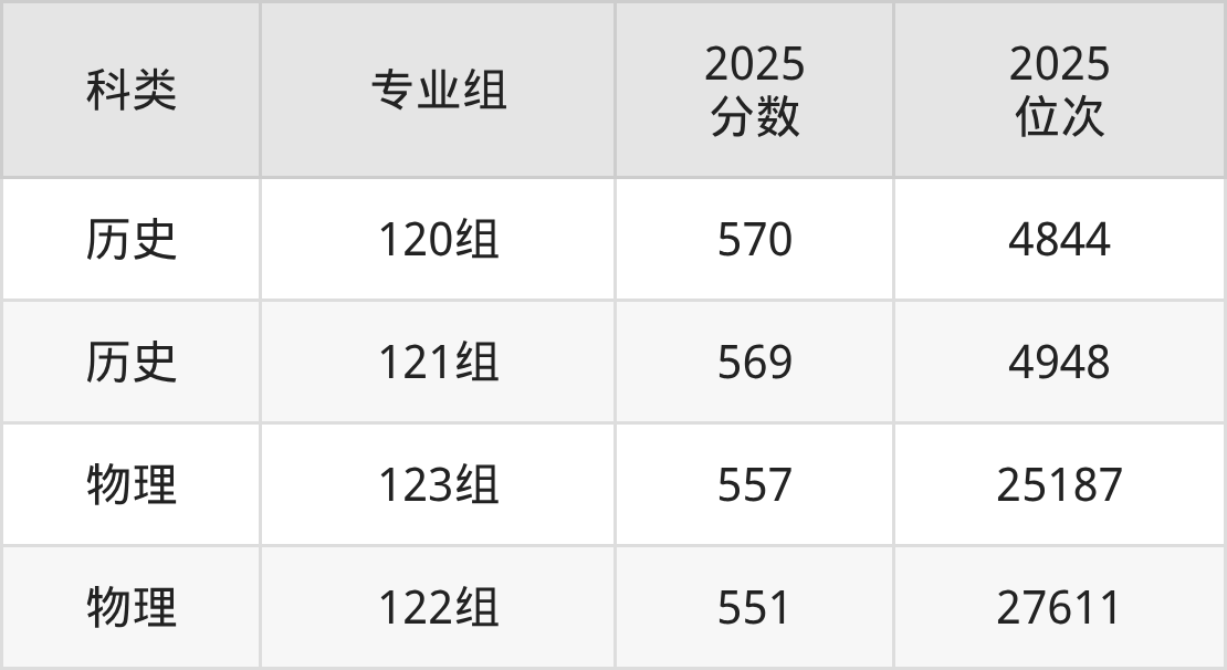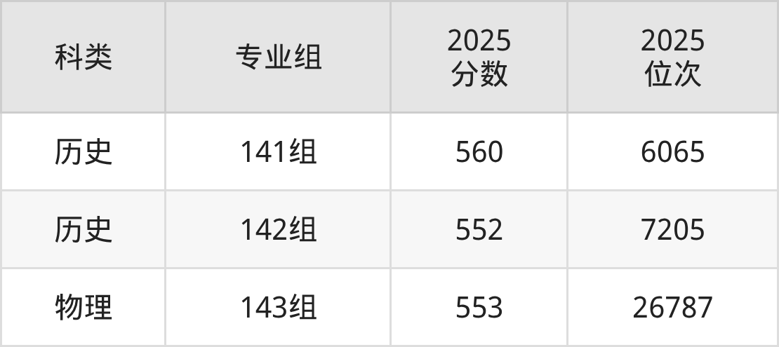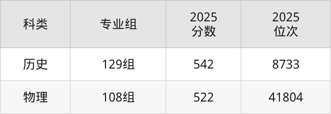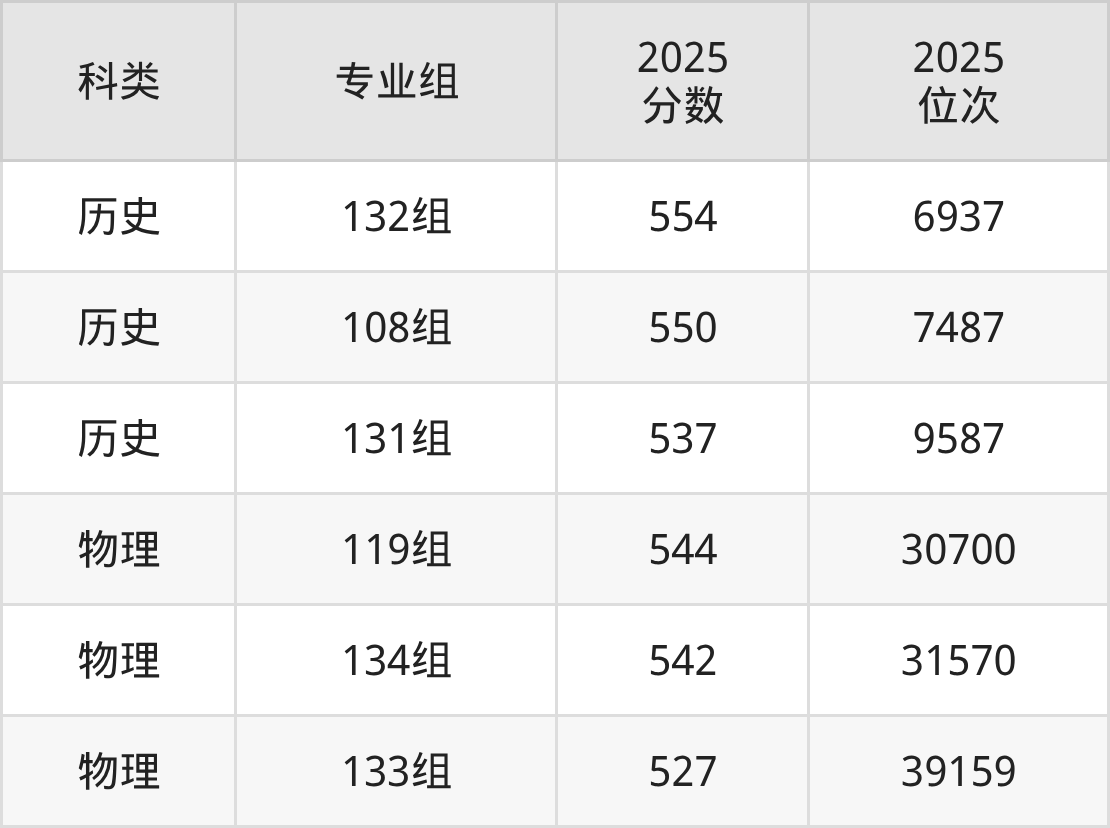 历史+不限:108组最低550分(位次7487名);131组最低537分(位次9587名);132组最低554分(位次6937名)。