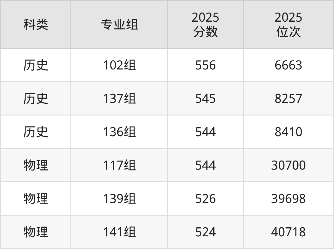 历史+不限:102组556分、位次6663名;136组544分、位次8410名。