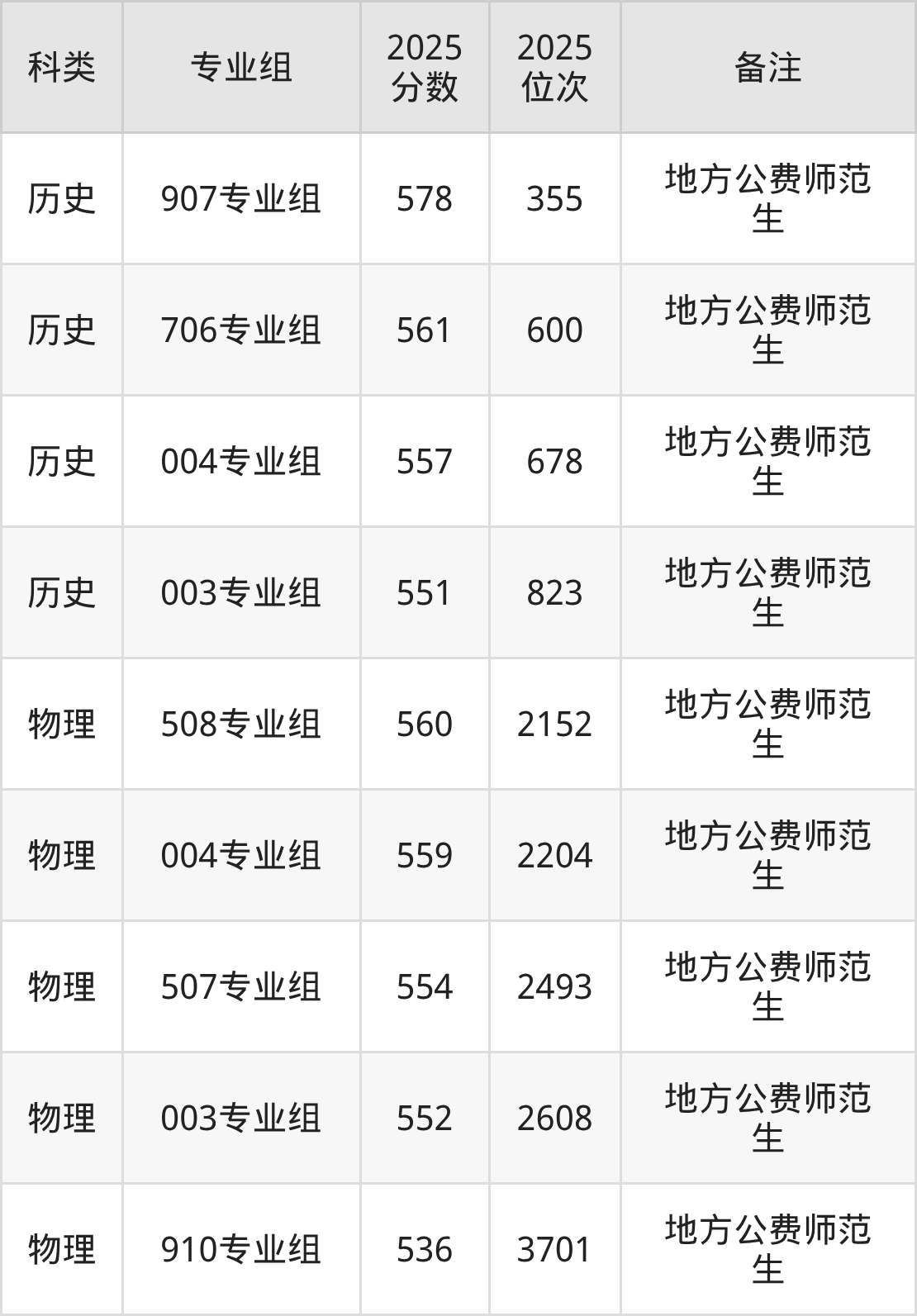 历史+不限:003专业组(地方公费师范生)551分、位次823名;004专业组(地方公费师范生)557分、位次678名。