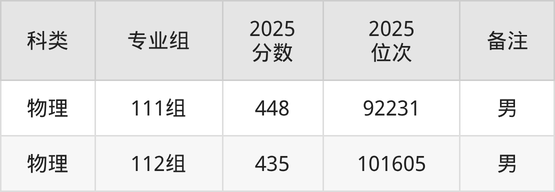 物理+不限:男生435分、位次101605名。