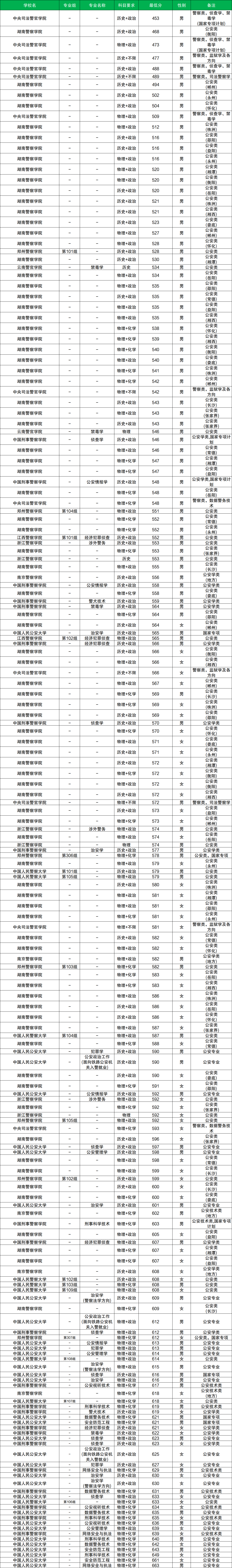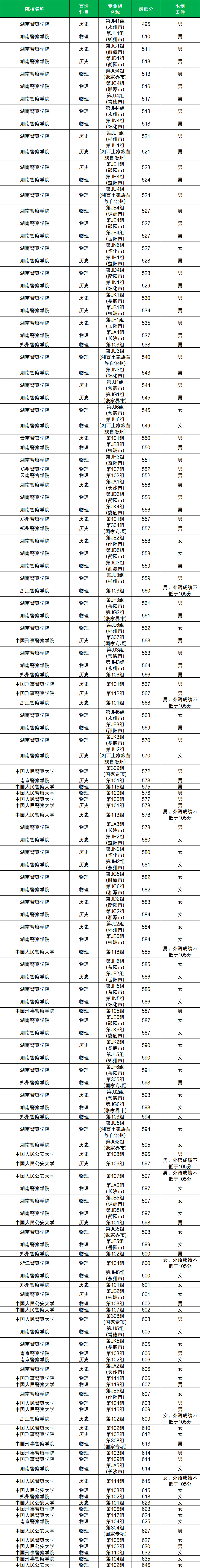 其中物理类男生分数至少在510分及以上、女生分数至少在527分及以上才有机会被录取。而物理类男生分数最低的院校是湖南警察学院(第JL4组,郴州市),物理类女生分数最低的院校是湖南警察学院(第JN6组,怀化市)。