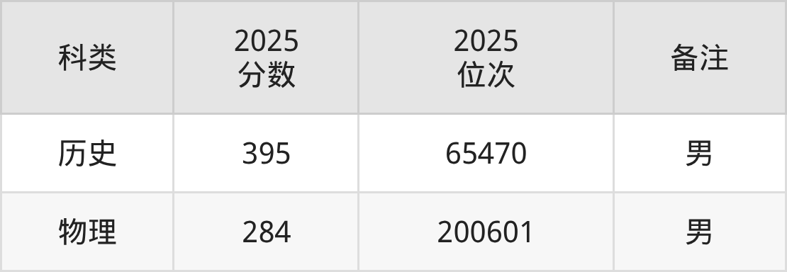物理+不限:男生284分、位次200601名。