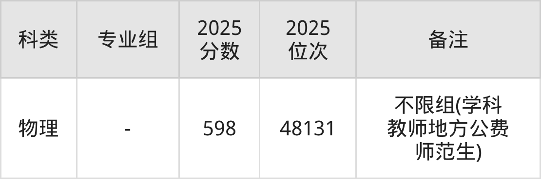 物理+不限:不限组(学科教师地方公费师范生)598分、位次48131名。