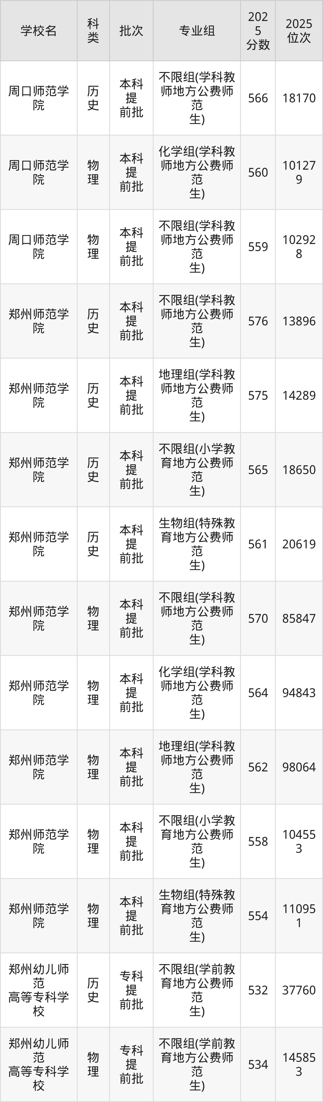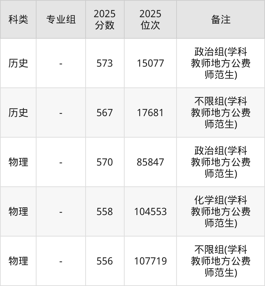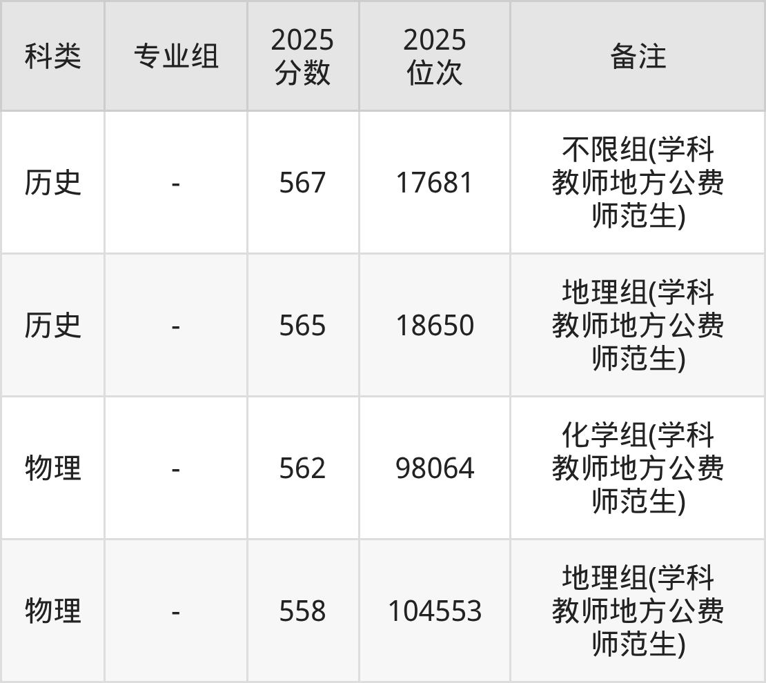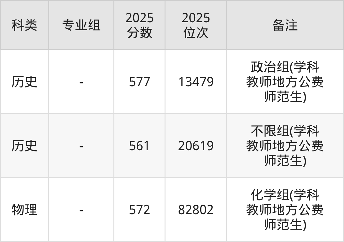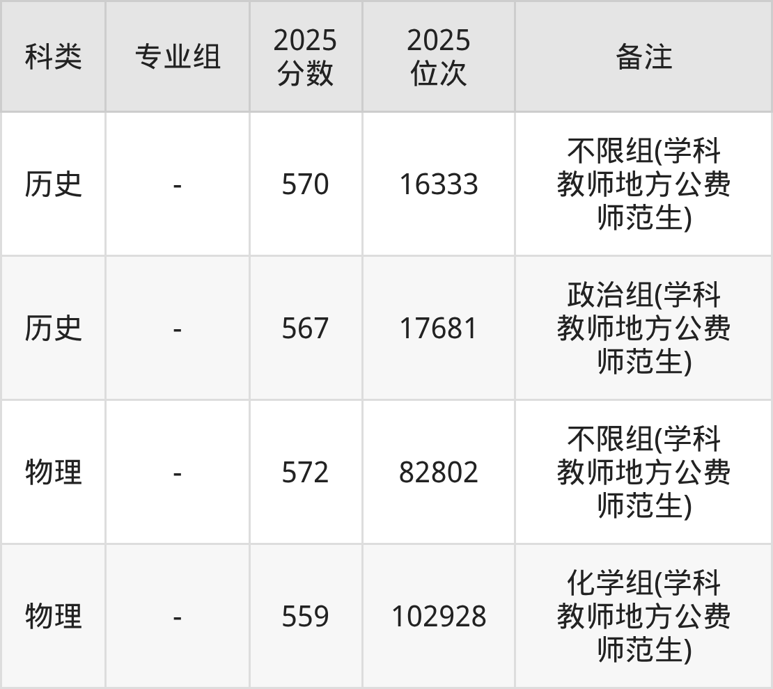 历史+不限:不限组(学科教师地方公费师范生)570分(位次16333名)。
