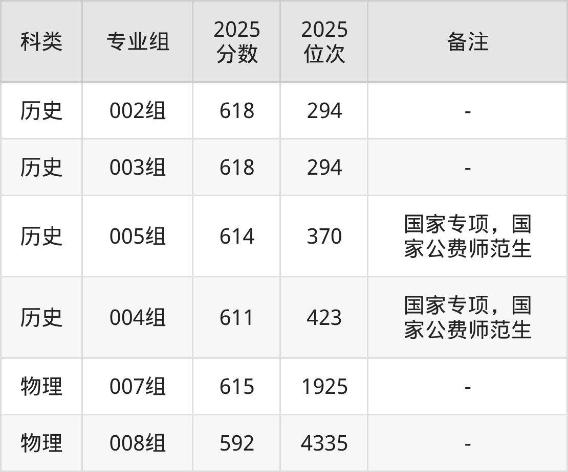 历史+不限:002组618分、位次294名;004组(国家专项)(国家公费师范生)611分、位次423名。