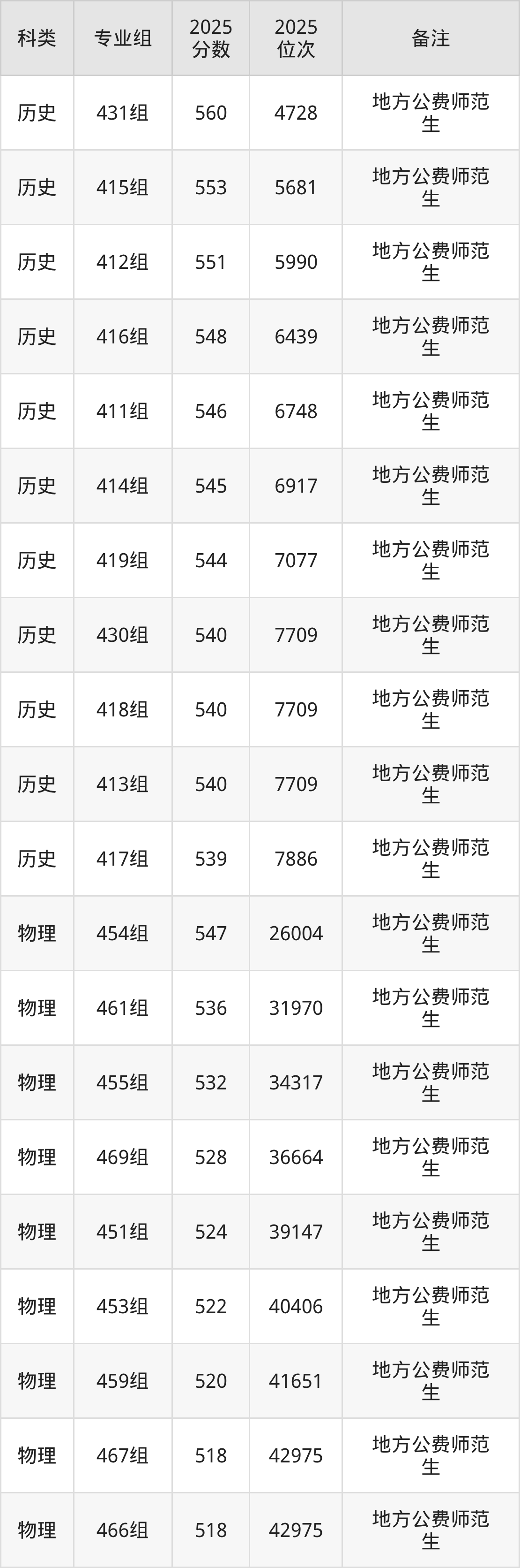 历史+不限:411组(地方公费师范生)546分、位次6748名;412组(地方公费师范生)551分、位次5990名;413组(地方公费师范生)540分、位次7709名;414组(地方公费师范生)545分、位次6917名;415组(地方公费师范生)553分、位次5681名等。