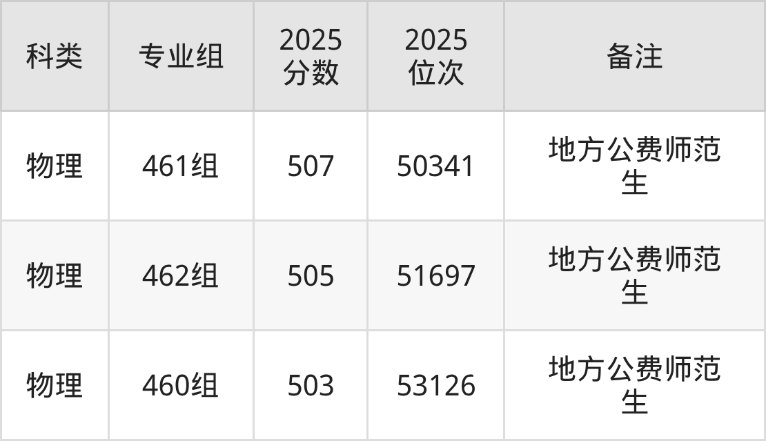 物理+化学:460组(地方公费师范生)最低503分(位次53126名);461组(地方公费师范生)最低507分(位次50341名);462组(地方公费师范生)最低505分(位次51697名)。