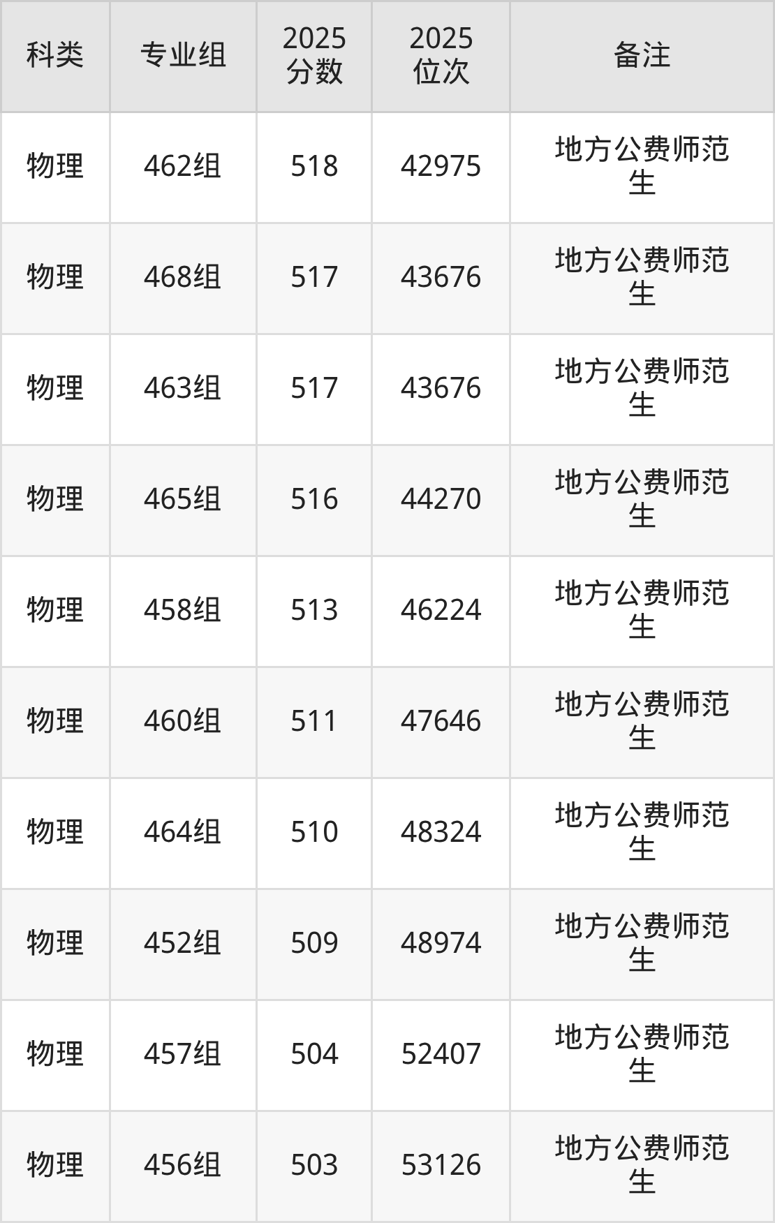 物理+不限:451组(地方公费师范生)524分、位次39147名;453组(地方公费师范生)522分、位次40406名;456组(地方公费师范生)503分、位次53126名;457组(地方公费师范生)504分、位次52407名;458组(地方公费师范生)513分、位次46224名等。