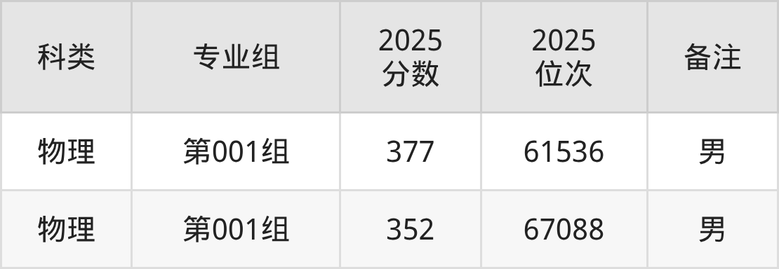 物理+化学:男生最低377分(位次61536名)。