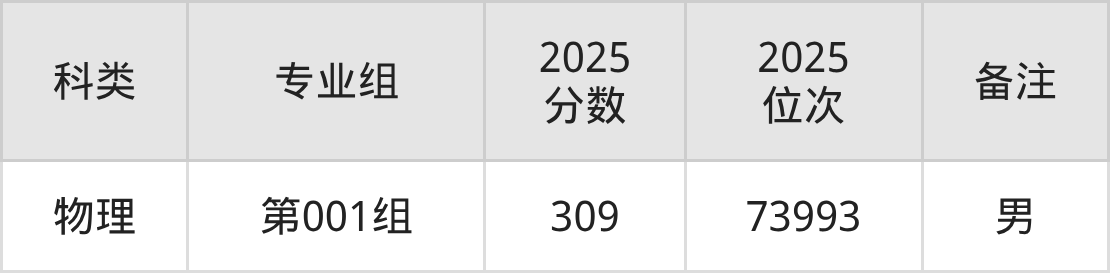 物理+不限:男生309分、位次73993名。
