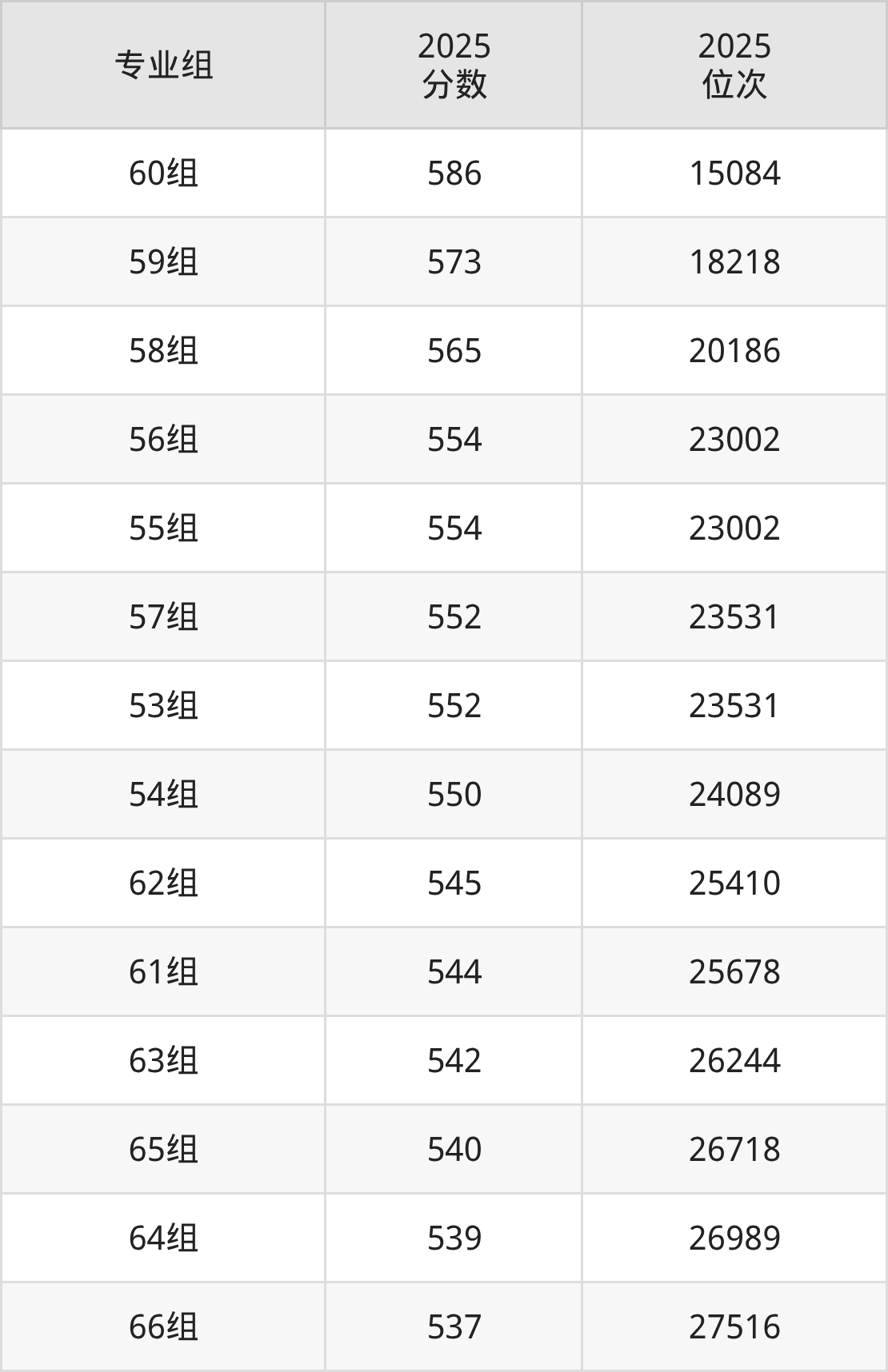 不限:53组552分、位次23531名;54组550分、位次24089名;55组554分、位次23002名;56组554分、位次23002名;57组552分、位次23531名。