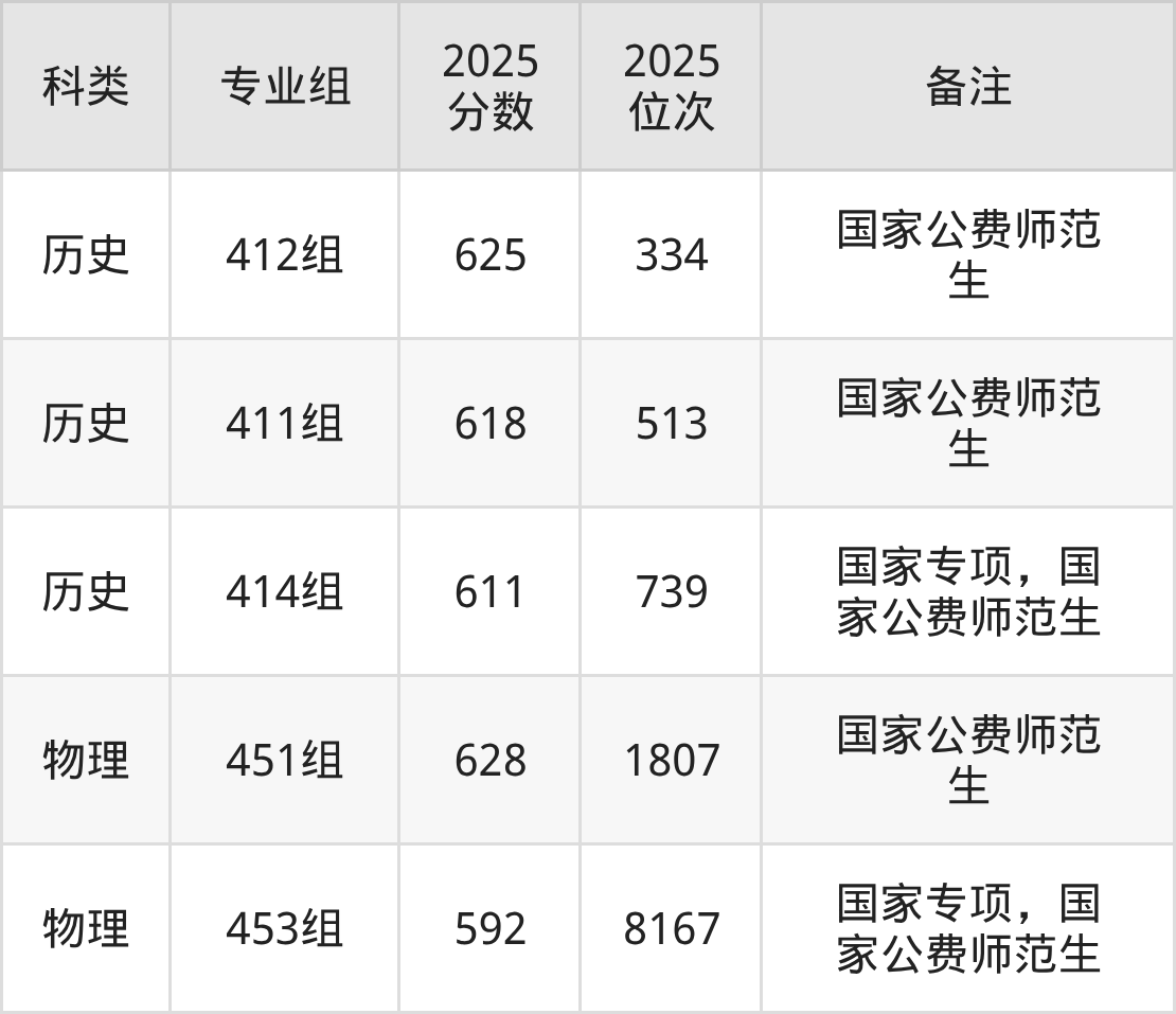 物理+化学:447组(国家公费师范生)最低616分(位次3222名);449组(国家公费师范生)最低612分(位次3835名)。