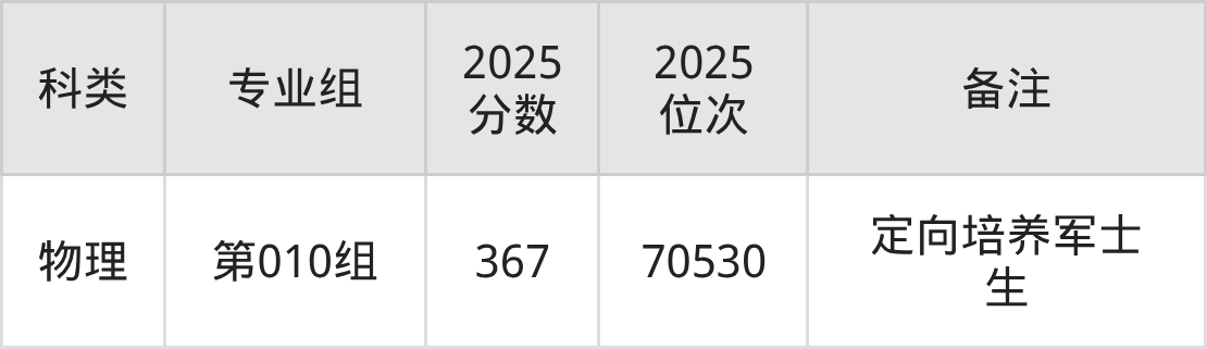 物理+不限:第010组(定向培养军士生)367分、位次70530名。