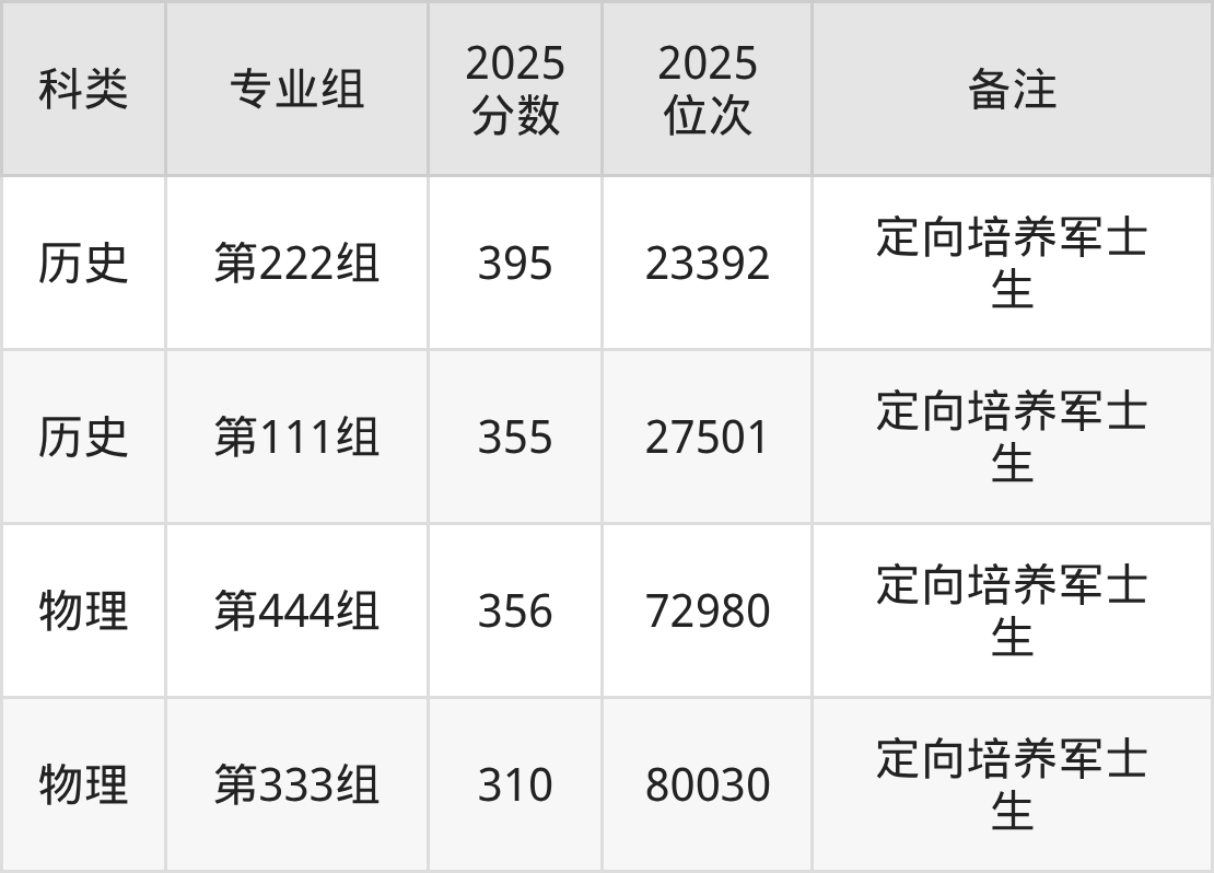 历史+不限:第111组(定向培养军士生)最低355分(位次27501名);第222组(定向培养军士生)最低395分(位次23392名)。
