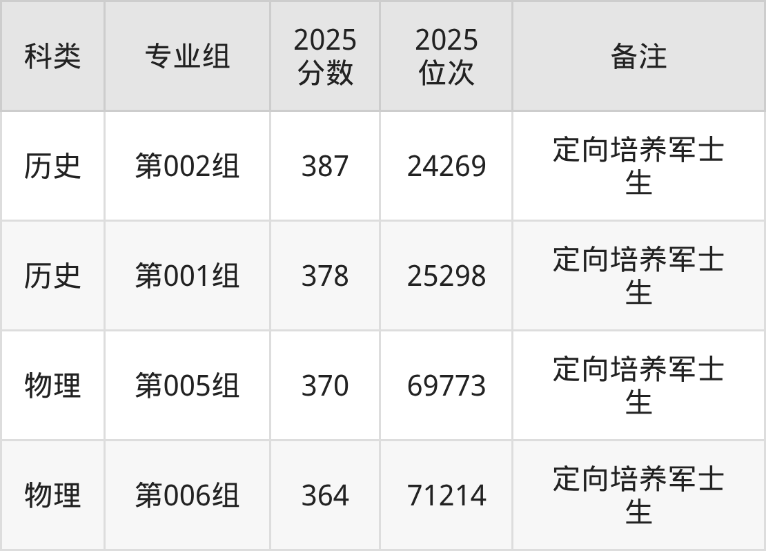 历史+不限:第001组(定向培养军士生)378分(位次25298名);第002组(定向培养军士生)387分(位次24269名)。