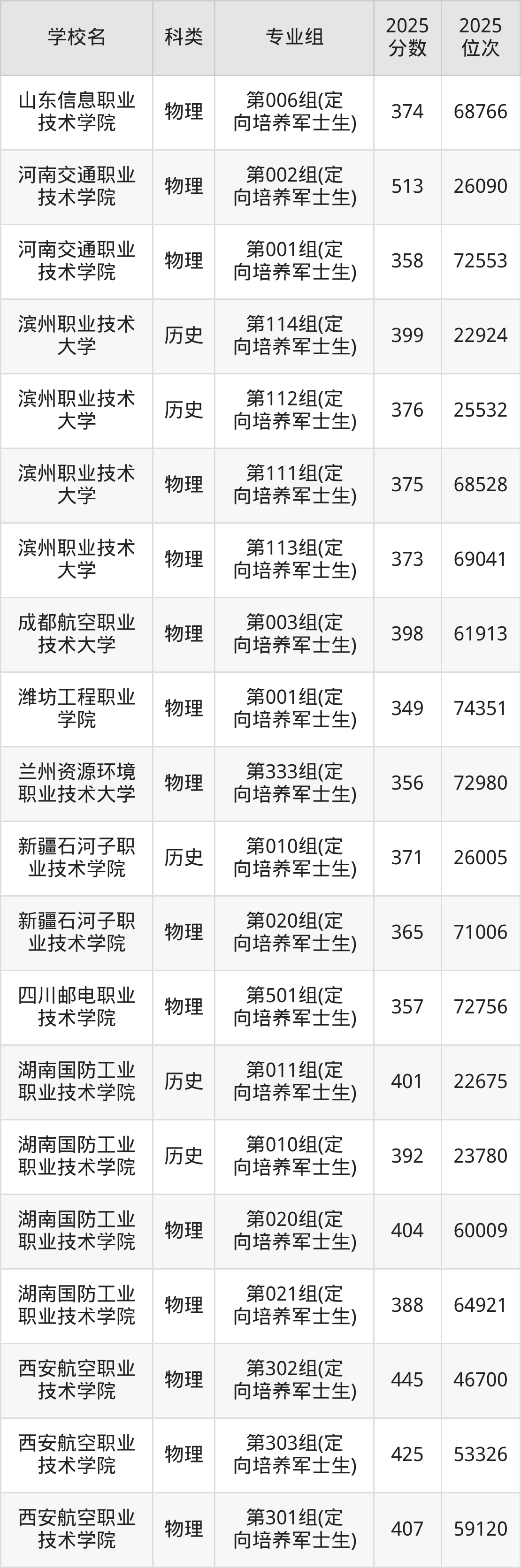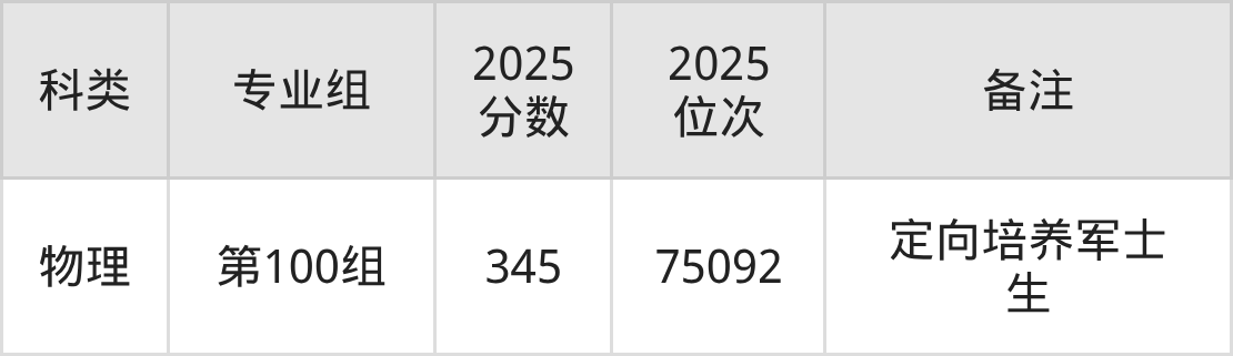 物理+不限:第100组(定向培养军士生)345分、位次75092名。