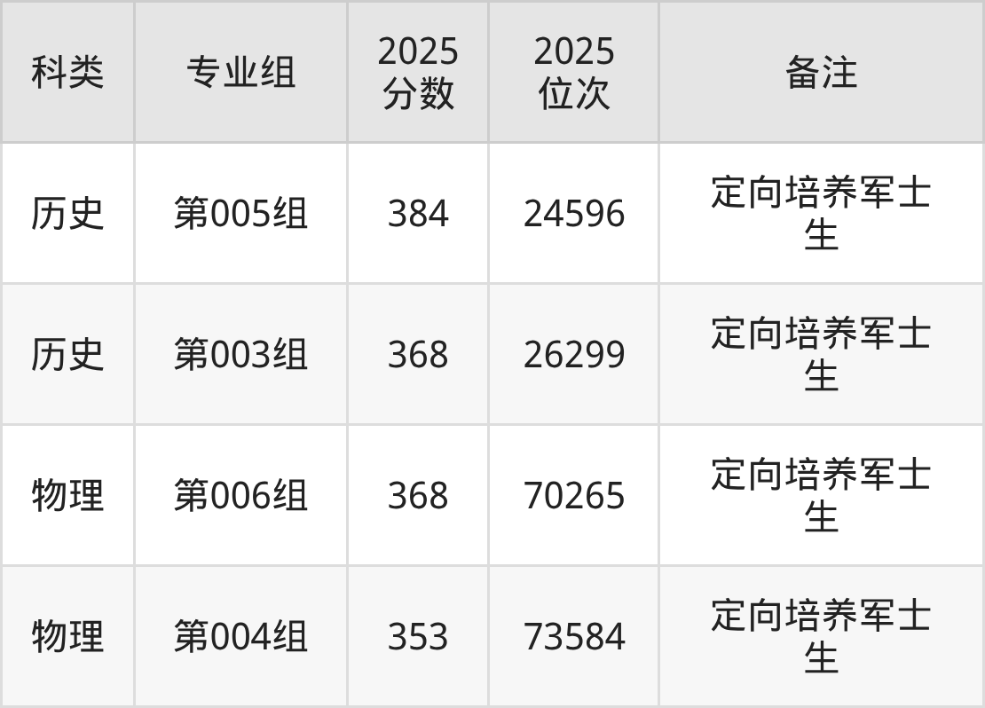 历史+不限:第003组(定向培养军士生)368分、位次26299名;第005组(定向培养军士生)384分、位次24596名。
