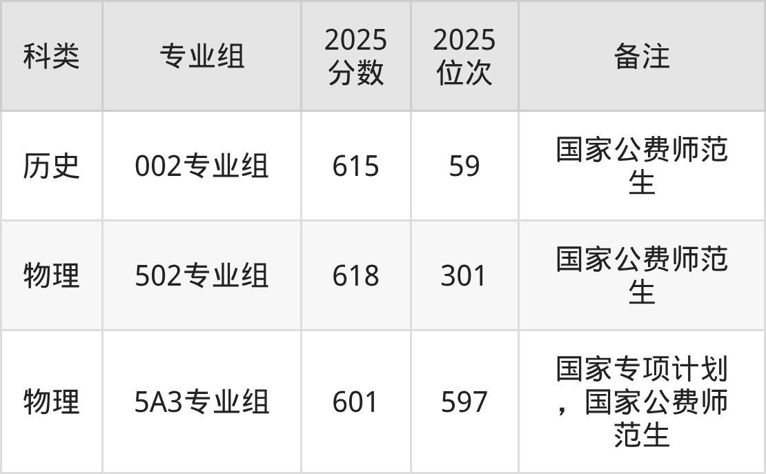 物理+化学:502专业组(国家公费师范生)618分、位次301名;5A3专业组(国家专项计划)(国家公费师范生)601分、位次597名。