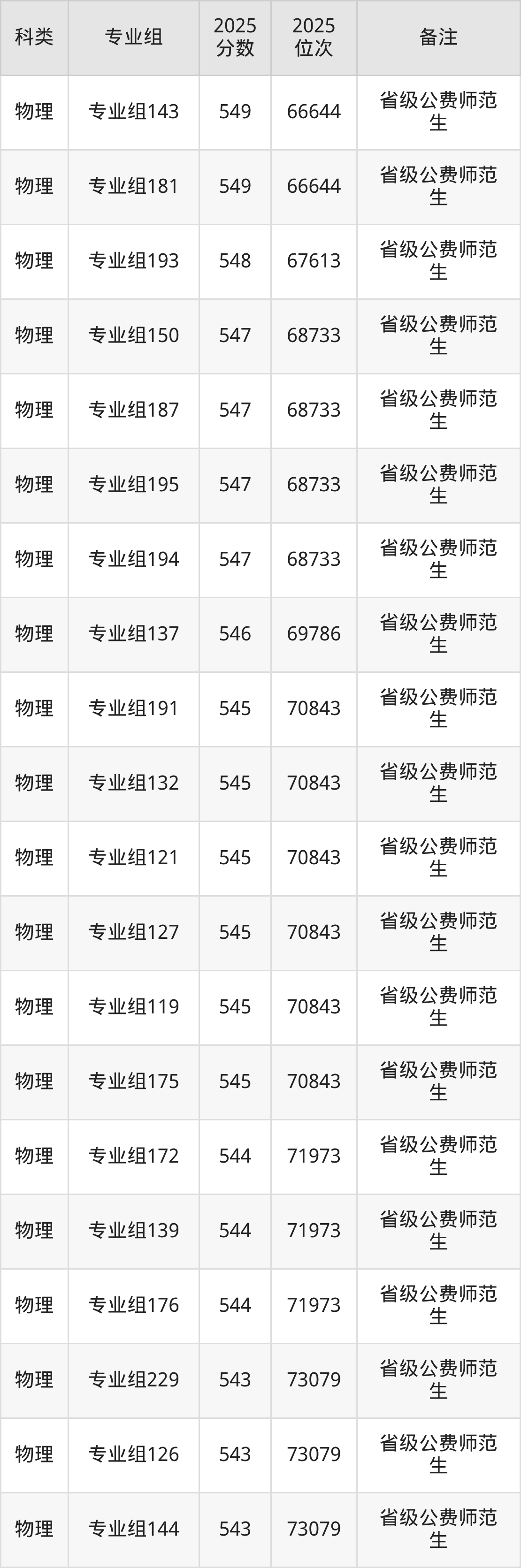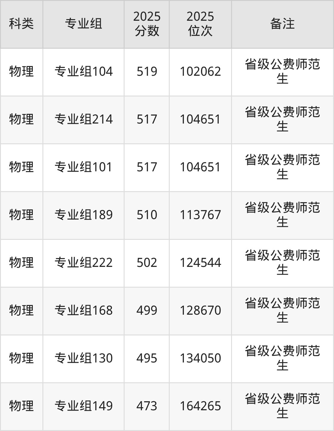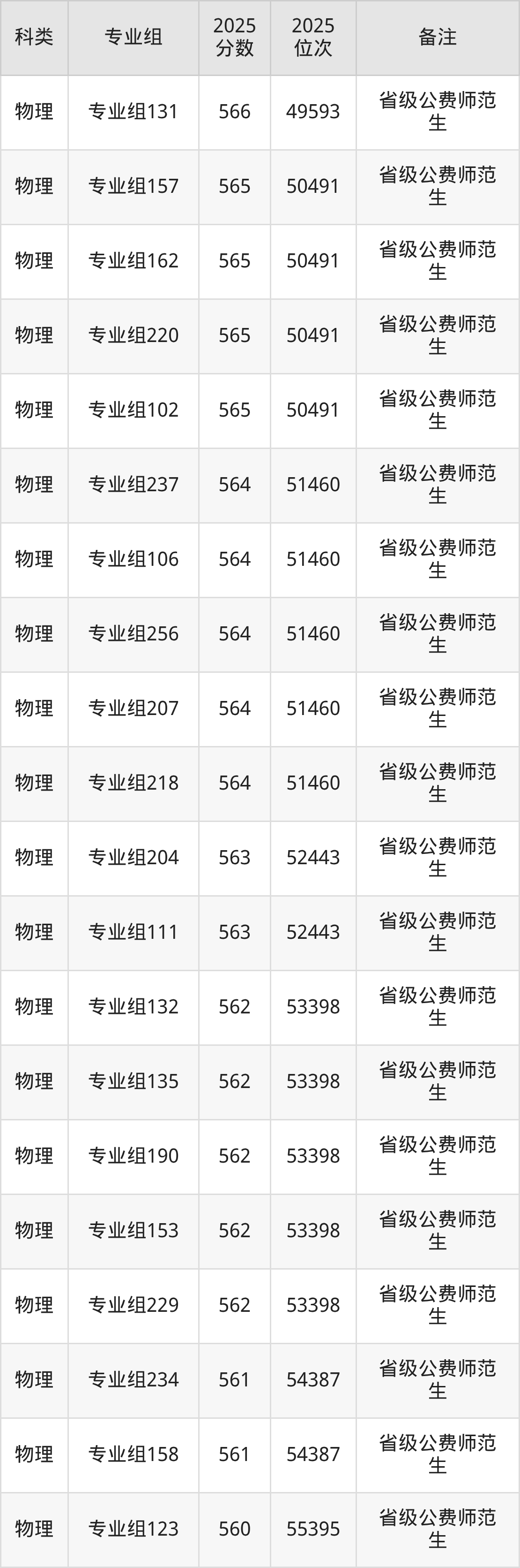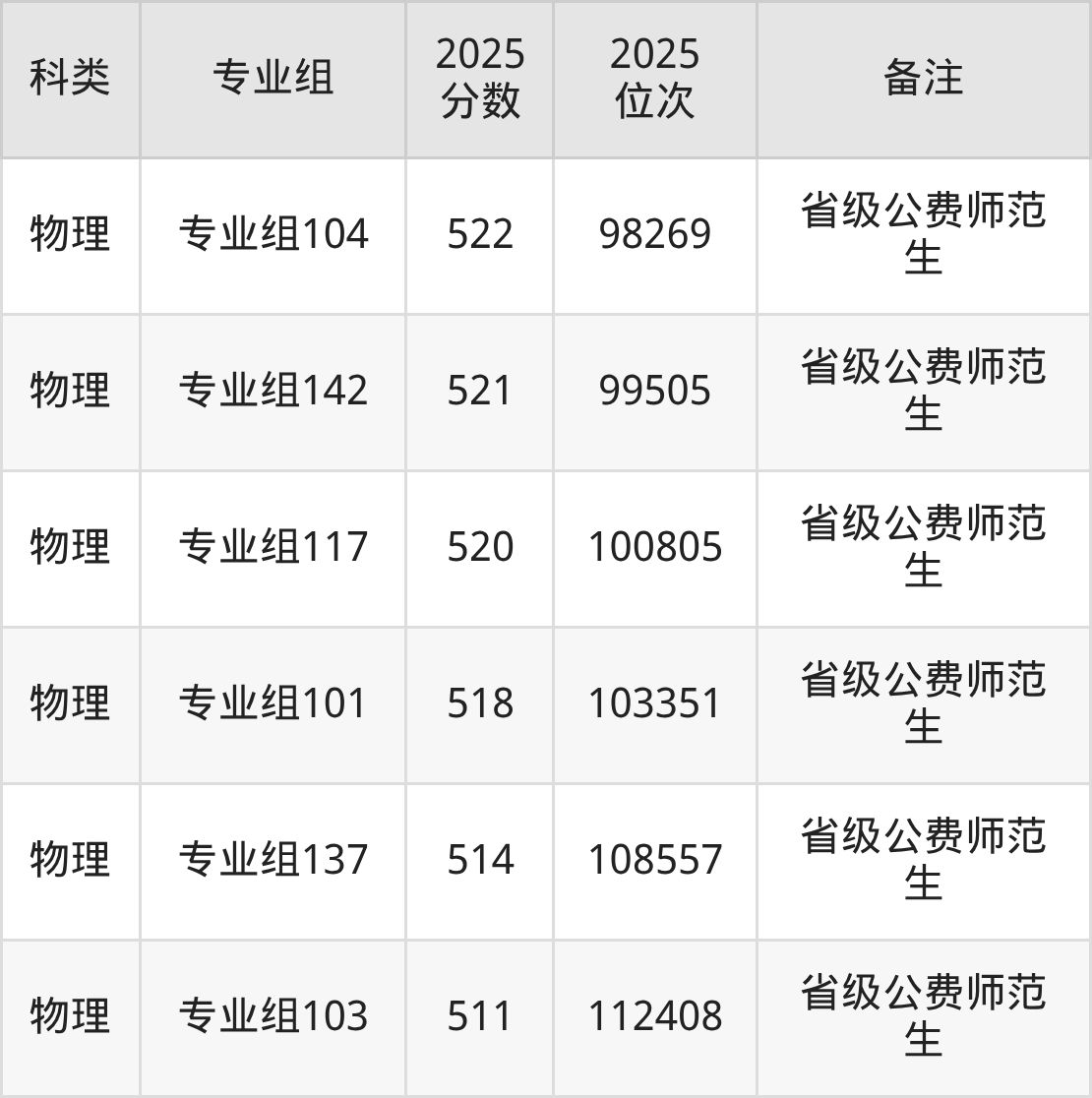 物理+不限:专业组101(省级公费师范生)510分、位次113767名;专业组102(省级公费师范生)565分、位次50491名;专业组103(省级公费师范生)578分、位次38996名;专业组104(省级公费师范生)537分、位次79949名;专业组105(省级公费师范生)553分、位次62454名等。