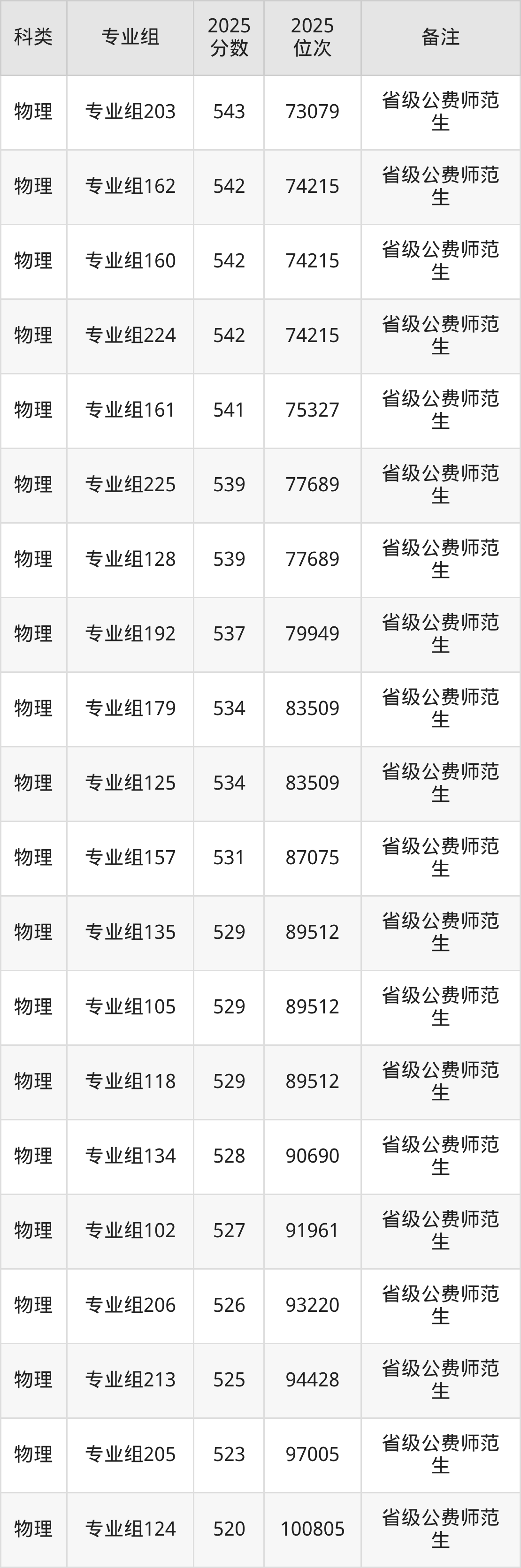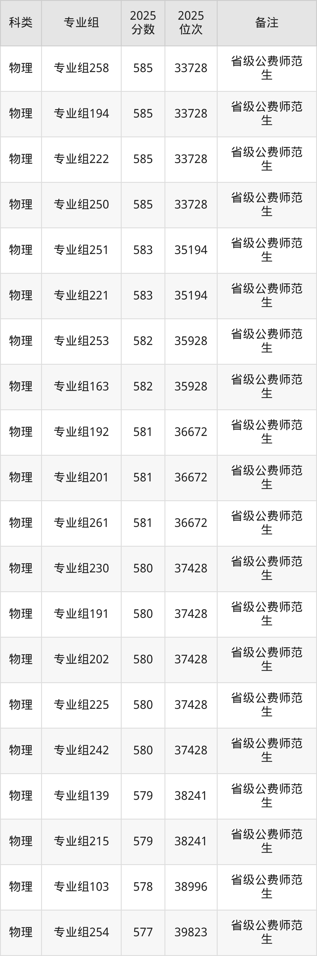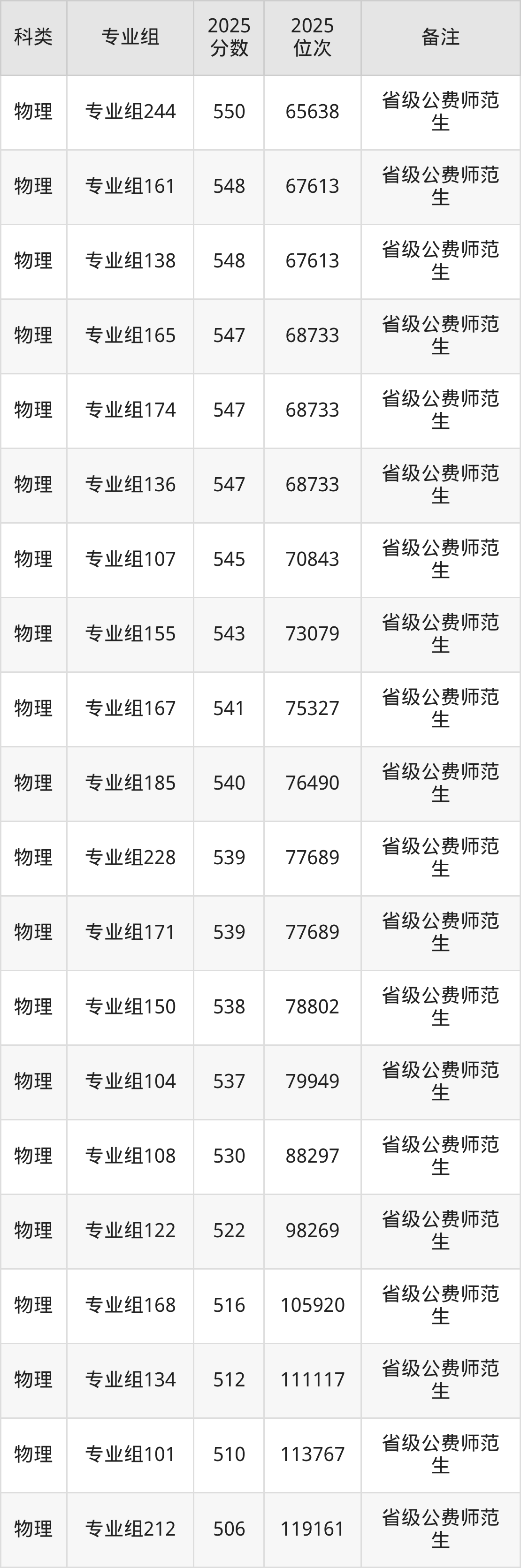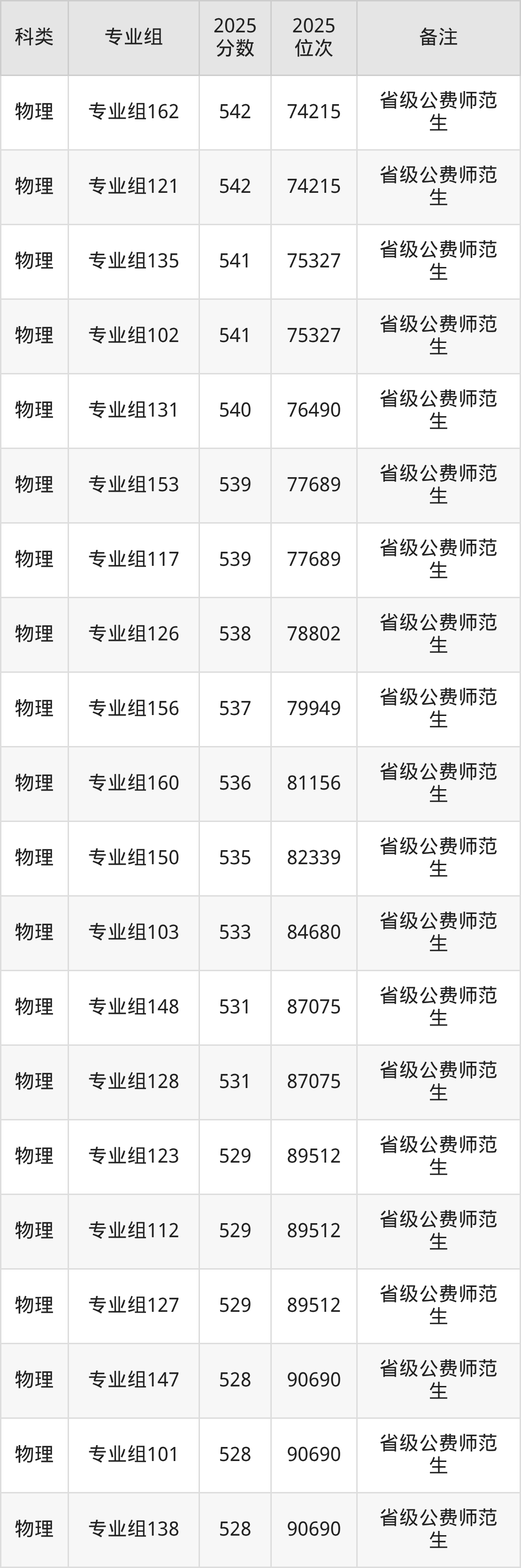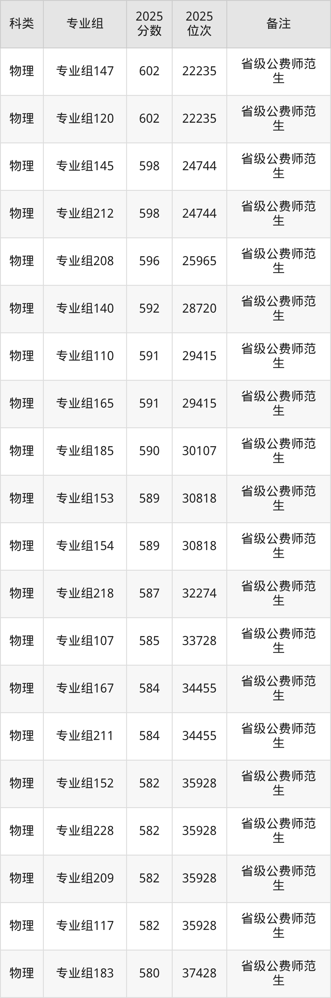 物理+不限:专业组101(省级公费师范生)510分、位次113767名;专业组102(省级公费师范生)565分、位次50491名;专业组103(省级公费师范生)578分、位次38996名;专业组104(省级公费师范生)537分、位次79949名;专业组105(省级公费师范生)553分、位次62454名等。