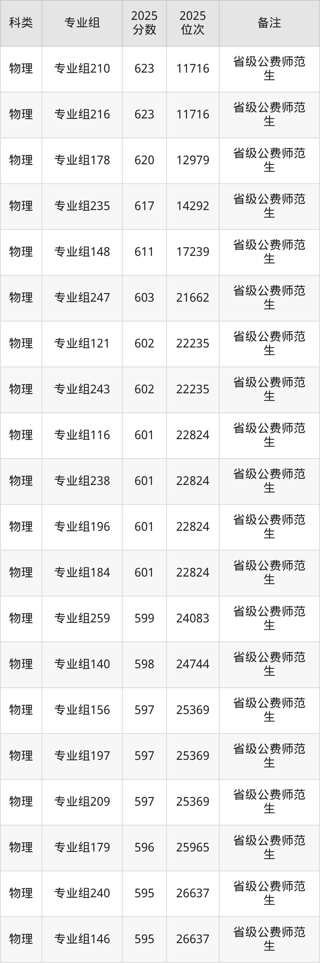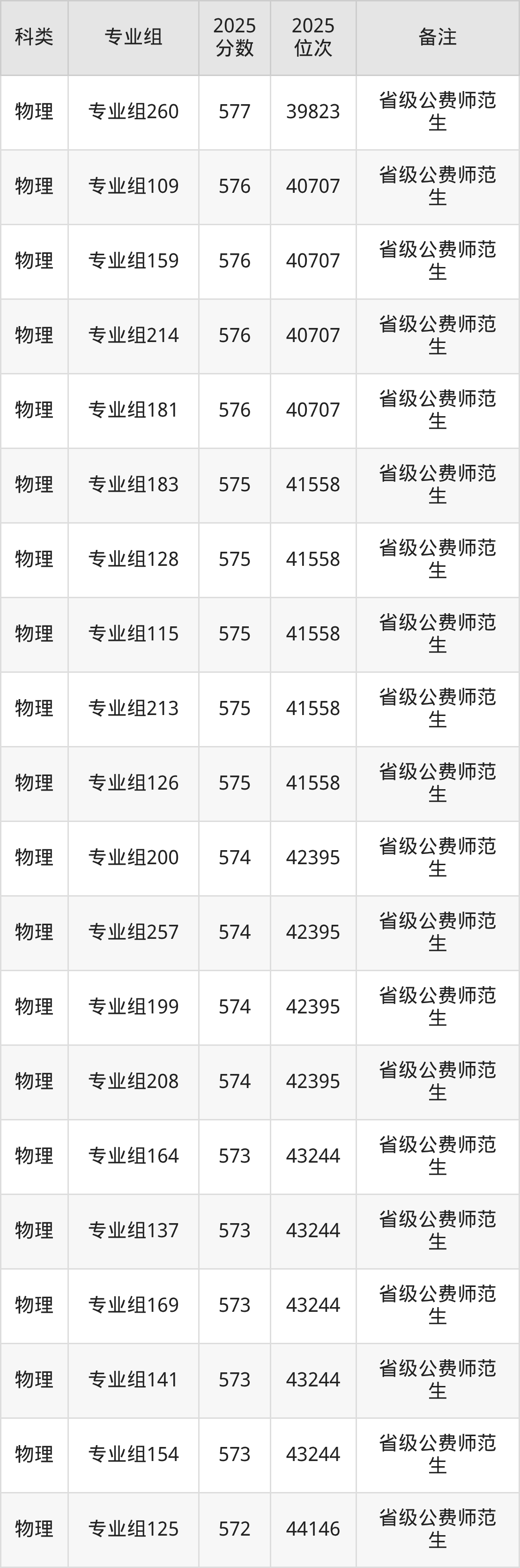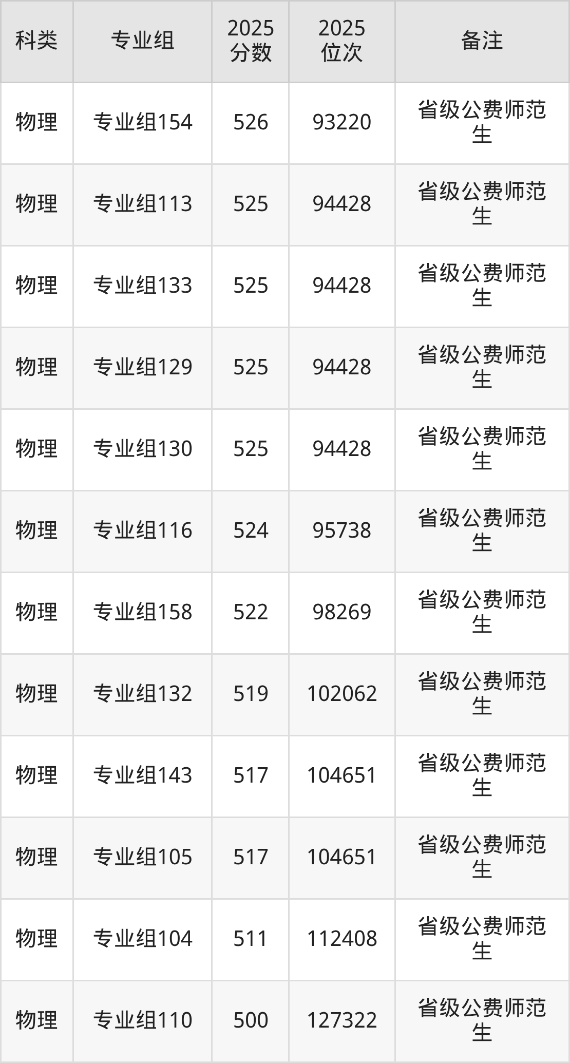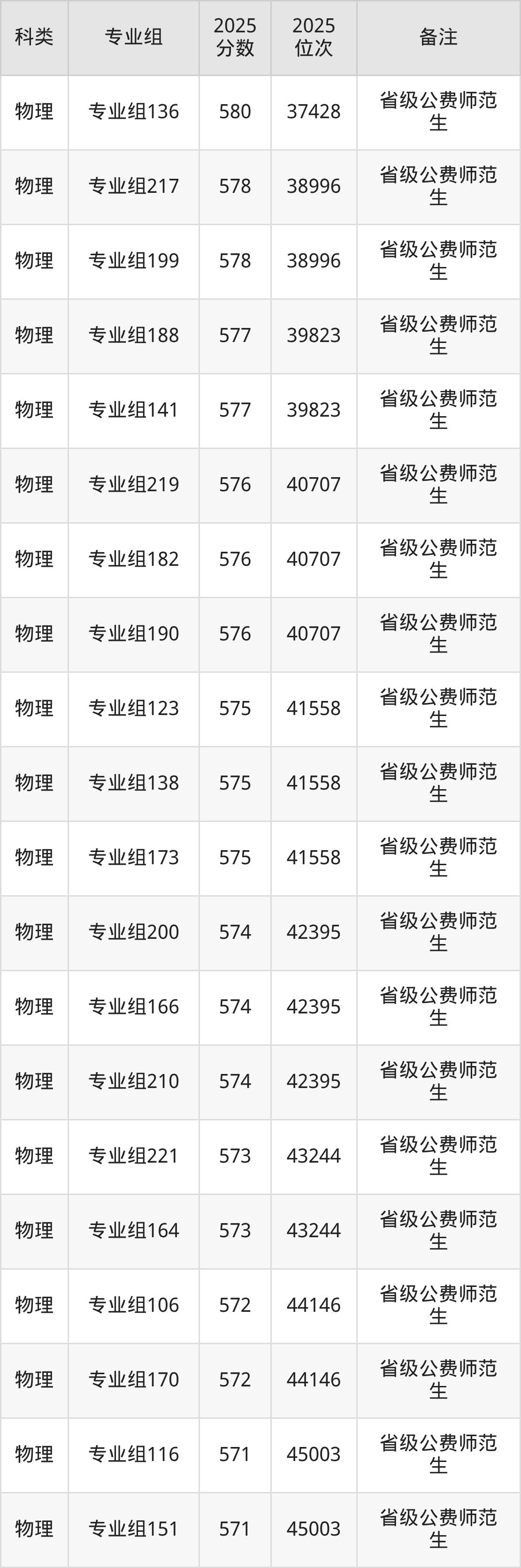物理+不限:专业组101(省级公费师范生)510分、位次113767名;专业组102(省级公费师范生)565分、位次50491名;专业组103(省级公费师范生)578分、位次38996名;专业组104(省级公费师范生)537分、位次79949名;专业组105(省级公费师范生)553分、位次62454名等。
