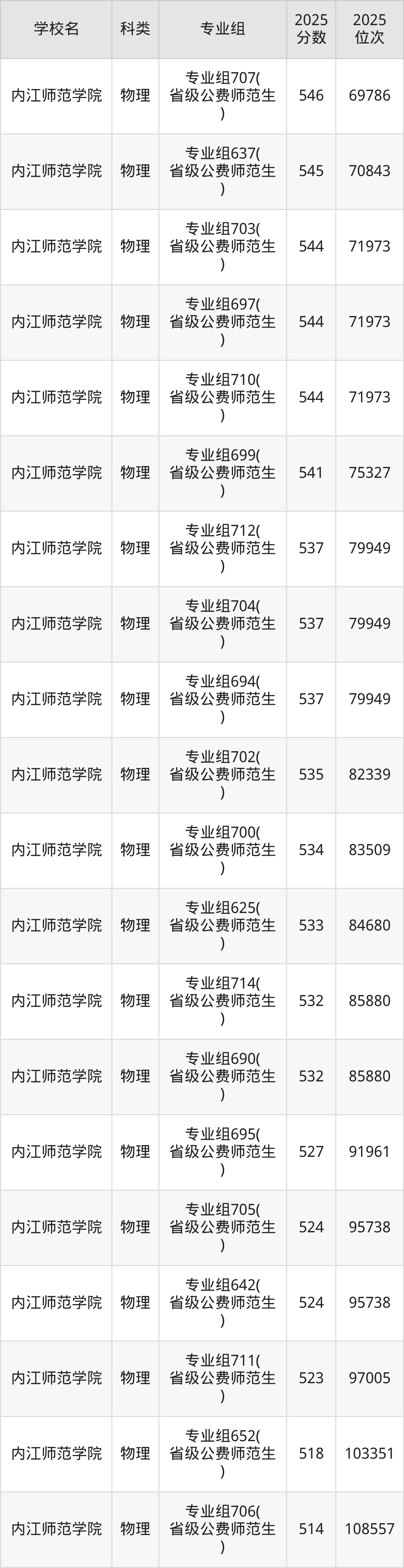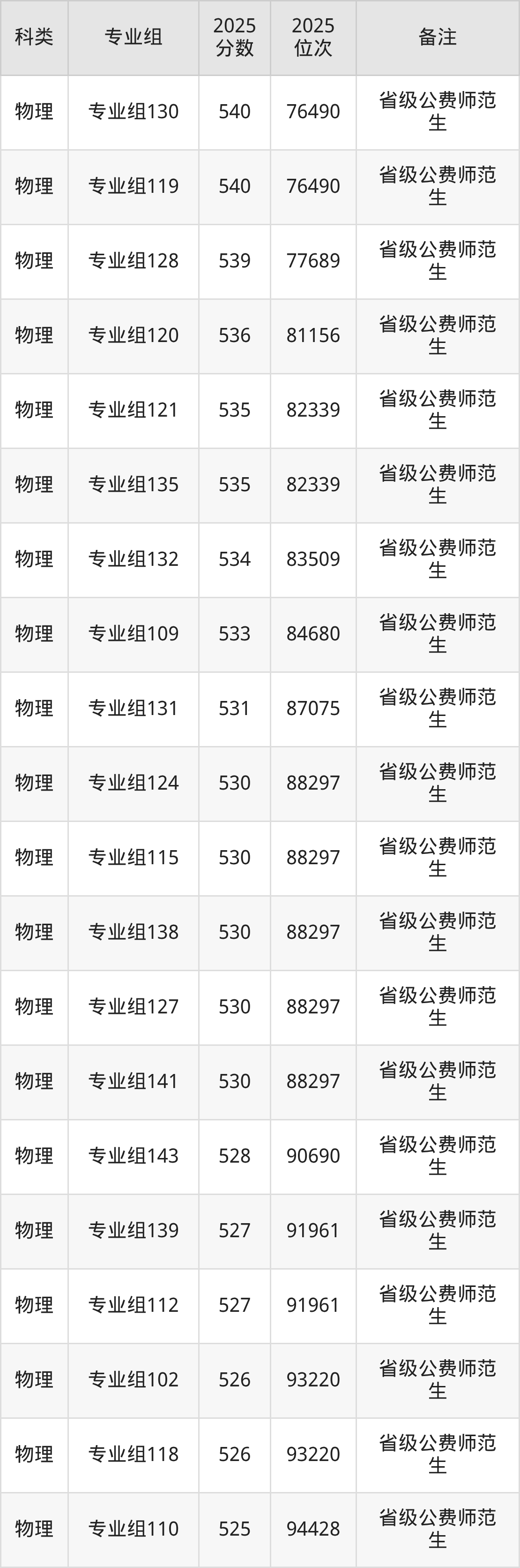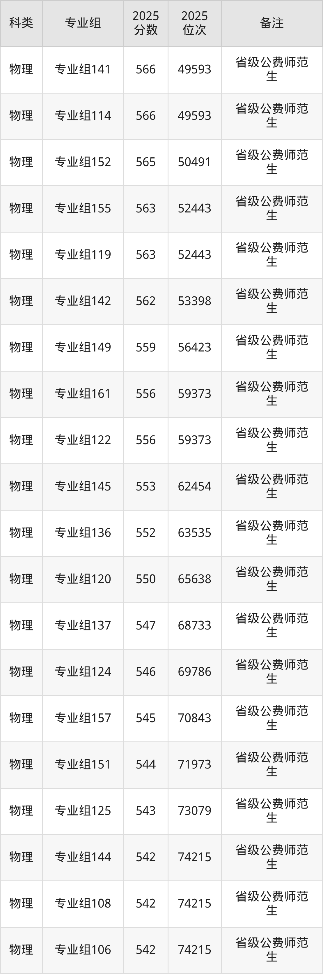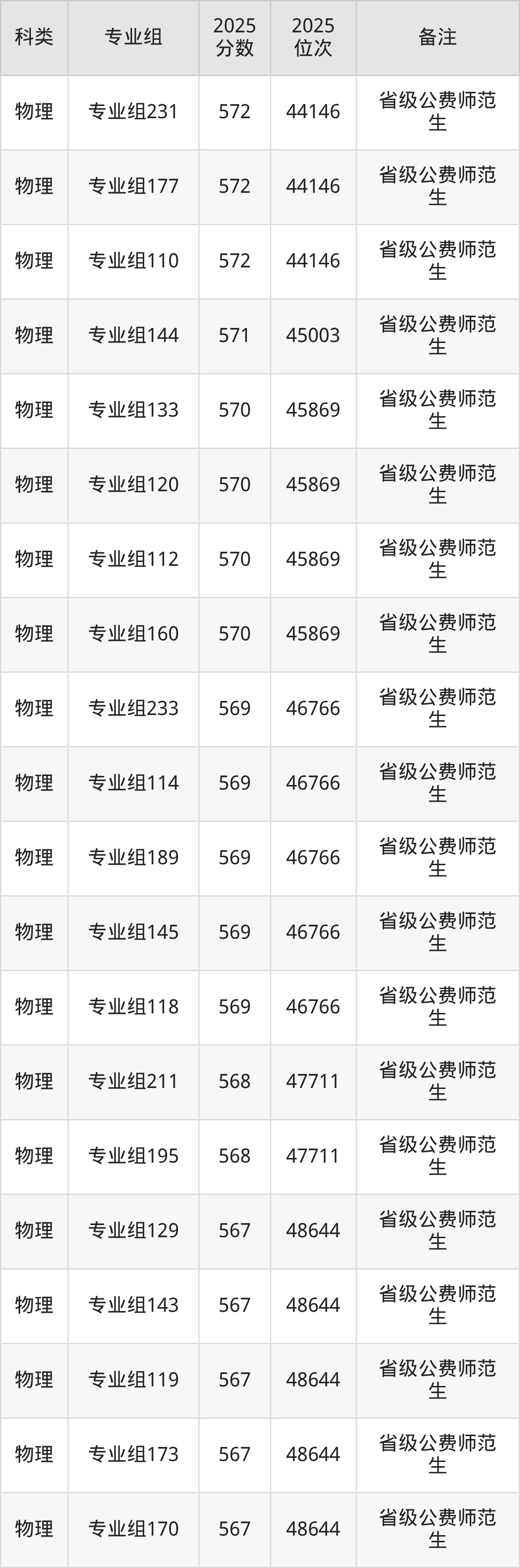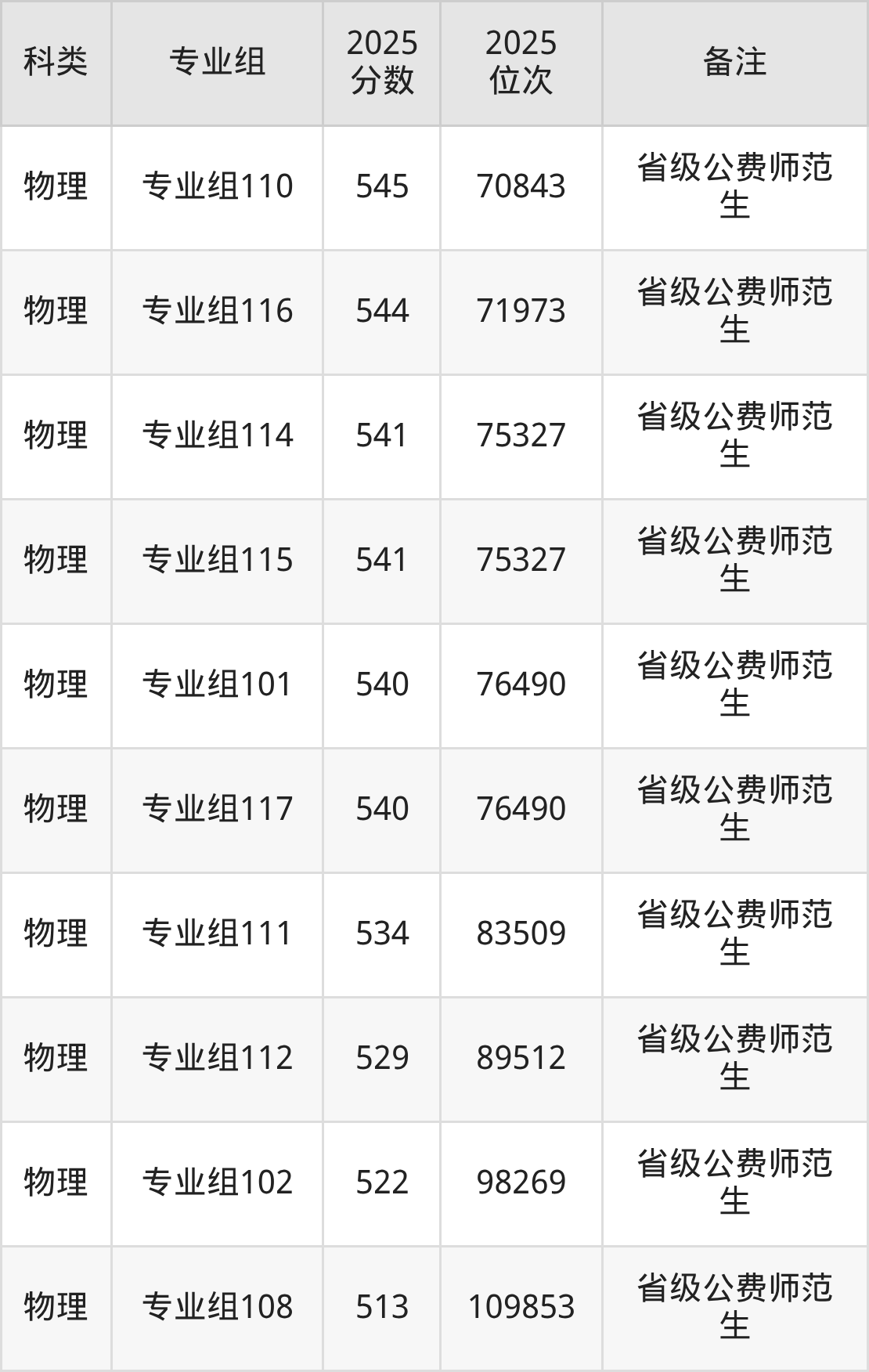 物理+不限:专业组101(省级公费师范生)510分、位次113767名;专业组102(省级公费师范生)565分、位次50491名;专业组103(省级公费师范生)578分、位次38996名;专业组104(省级公费师范生)537分、位次79949名;专业组105(省级公费师范生)553分、位次62454名等。