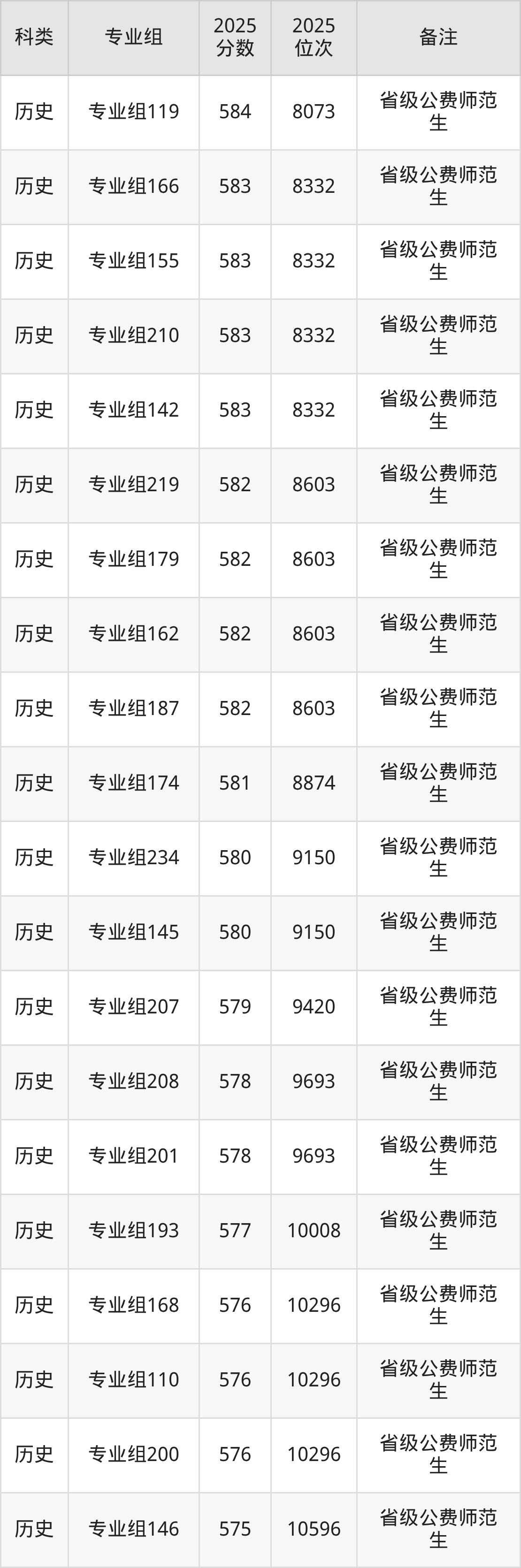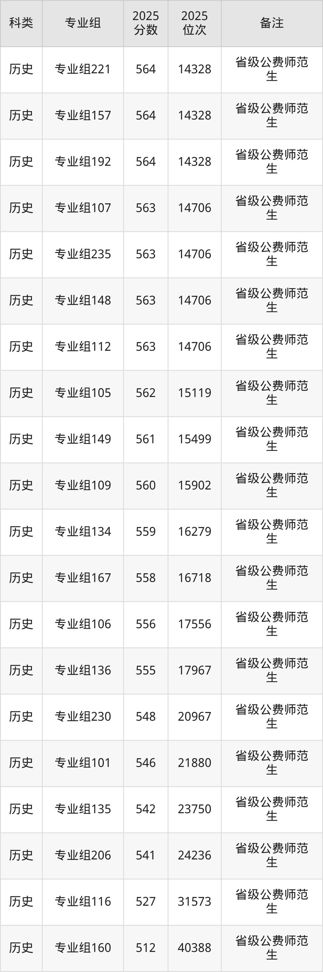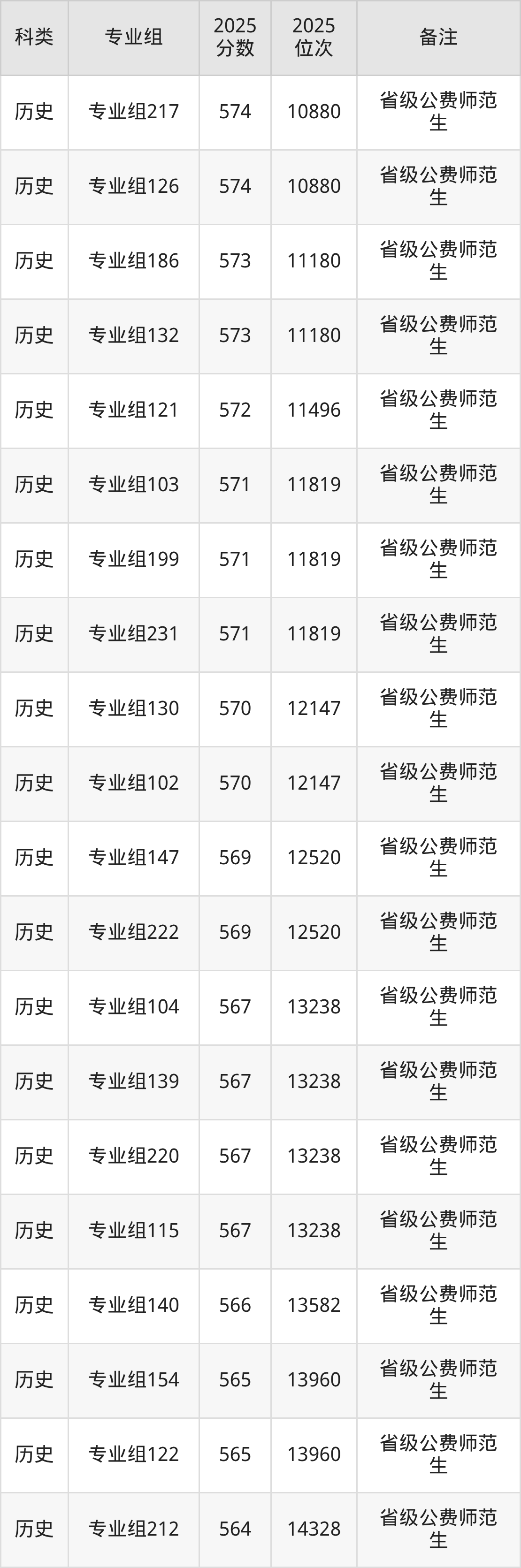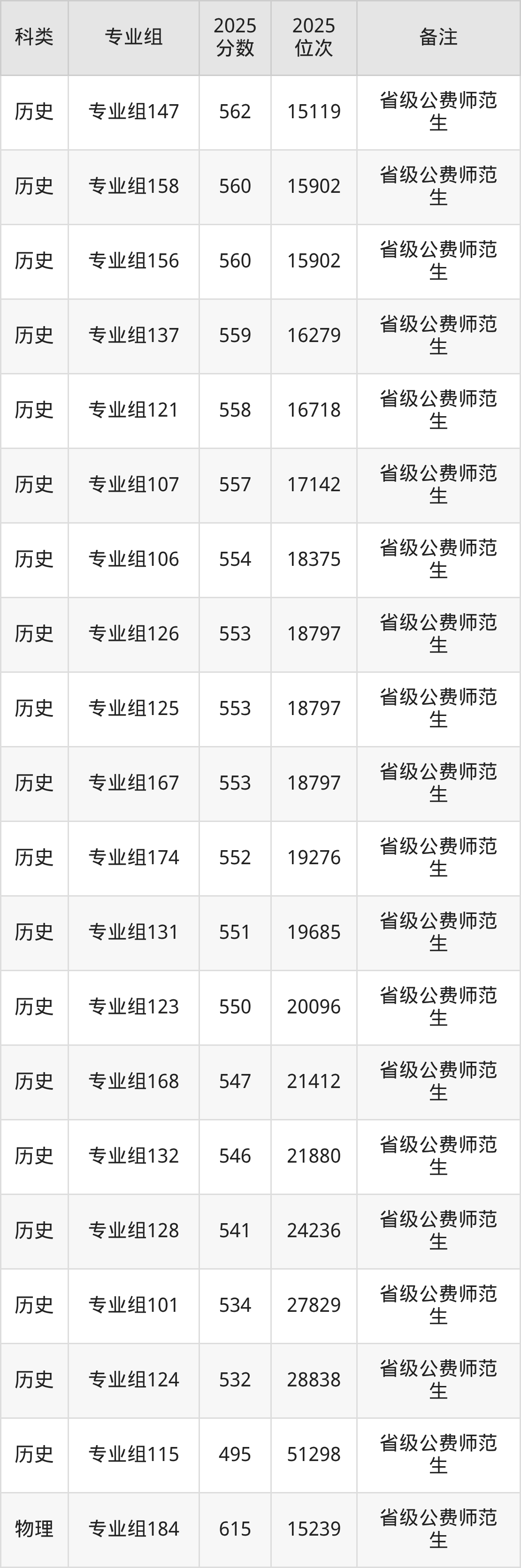 历史+地理:专业组206(省级公费师范生)541分、位次24236名;专业组207(省级公费师范生)579分、位次9420名;专业组208(省级公费师范生)578分、位次9693名;专业组209(省级公费师范生)586分、位次7556名;专业组210(省级公费师范生)583分、位次8332名等。