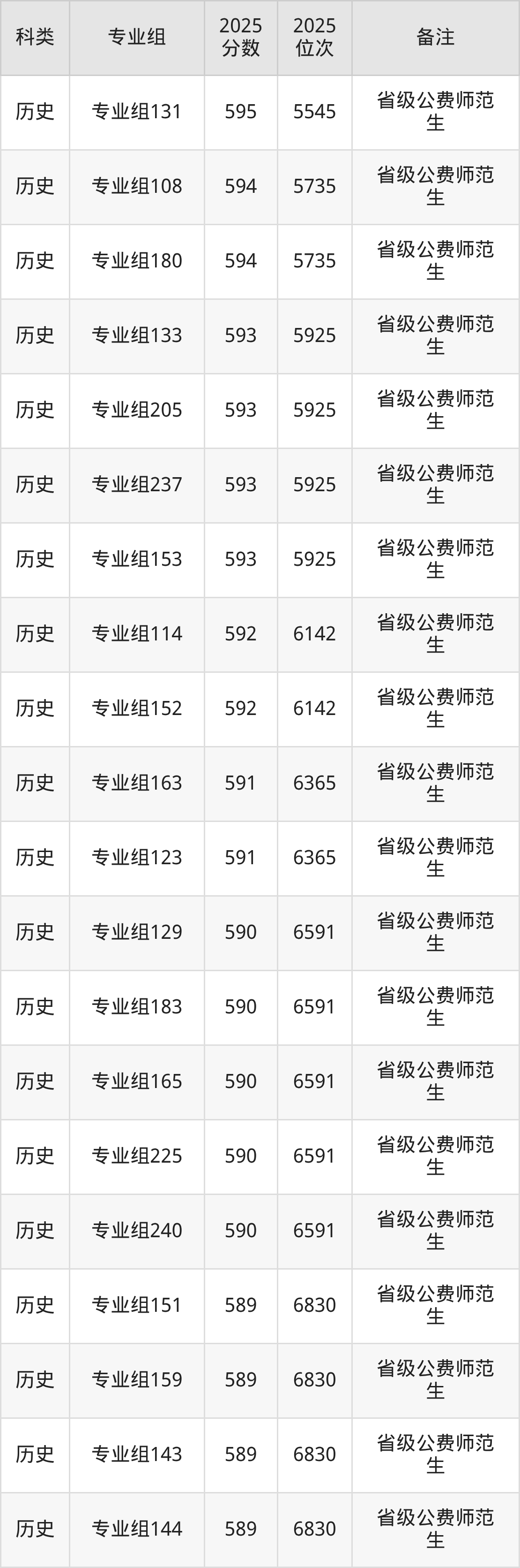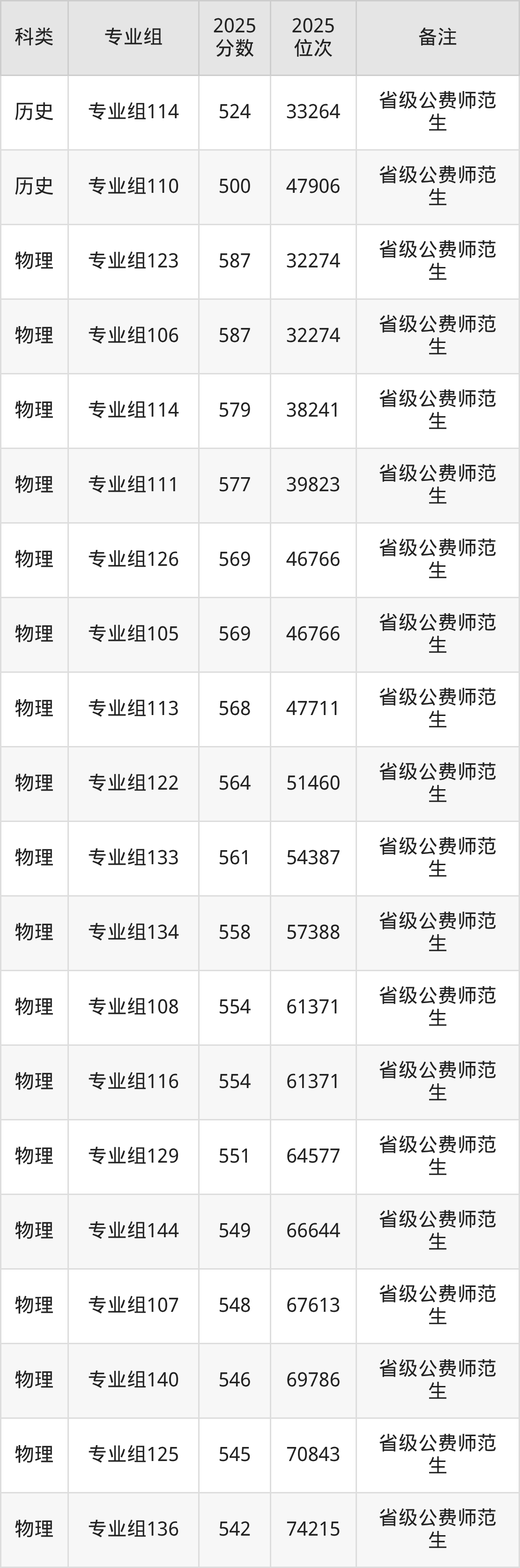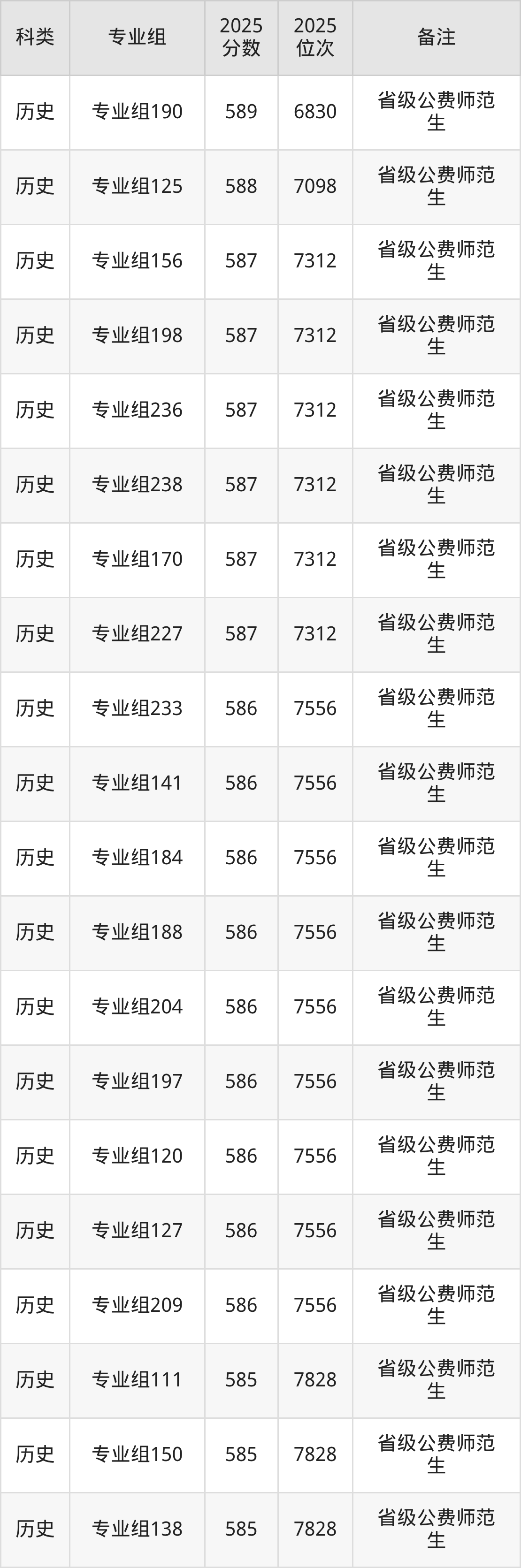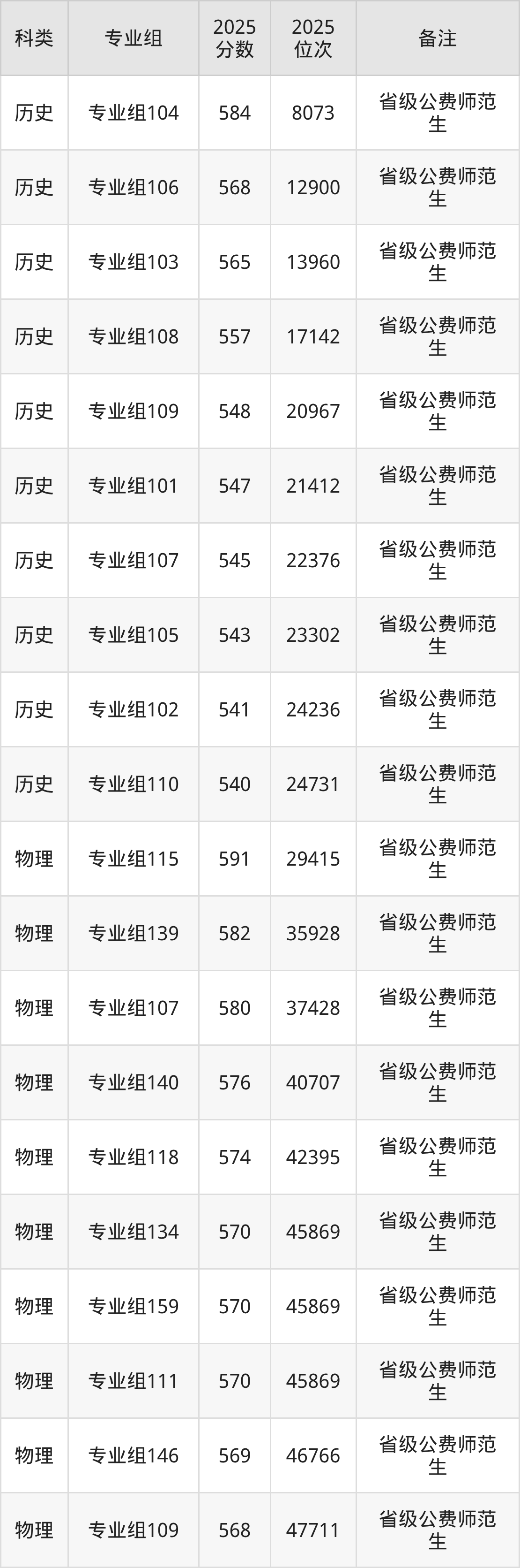 历史+地理:专业组206(省级公费师范生)541分、位次24236名;专业组207(省级公费师范生)579分、位次9420名;专业组208(省级公费师范生)578分、位次9693名;专业组209(省级公费师范生)586分、位次7556名;专业组210(省级公费师范生)583分、位次8332名等。