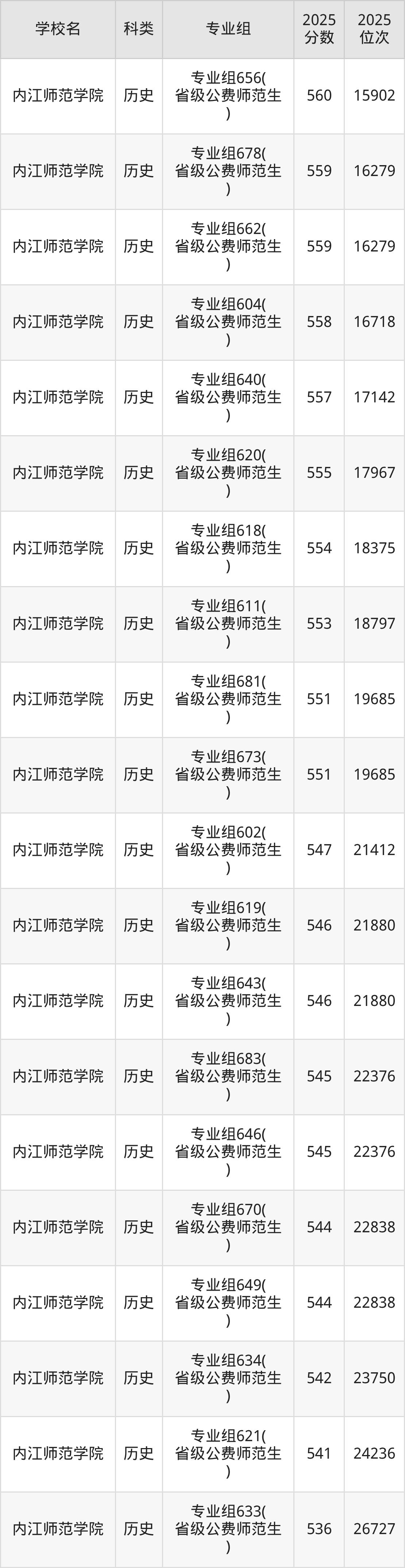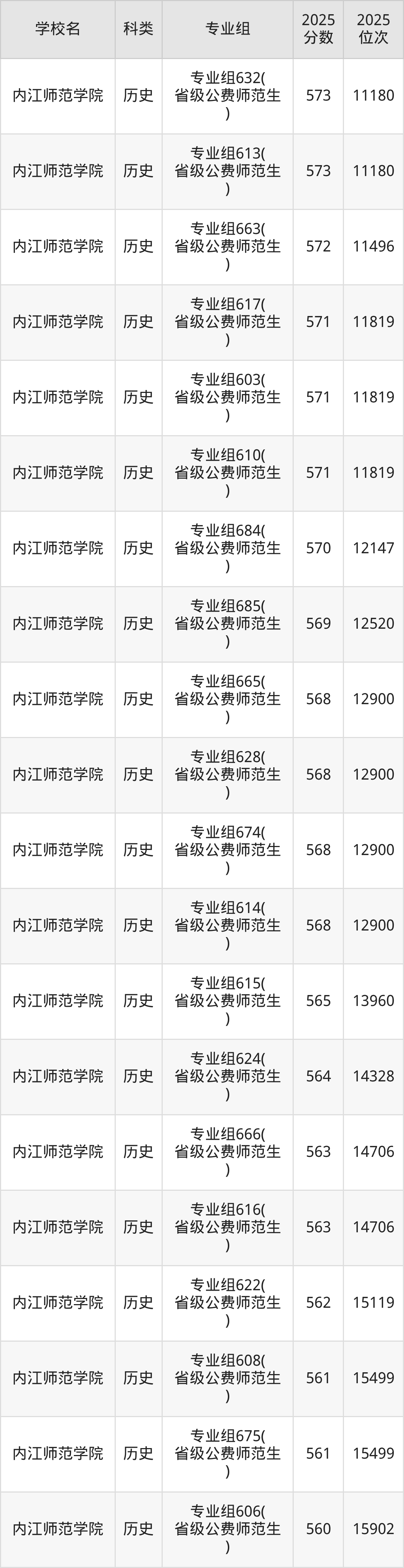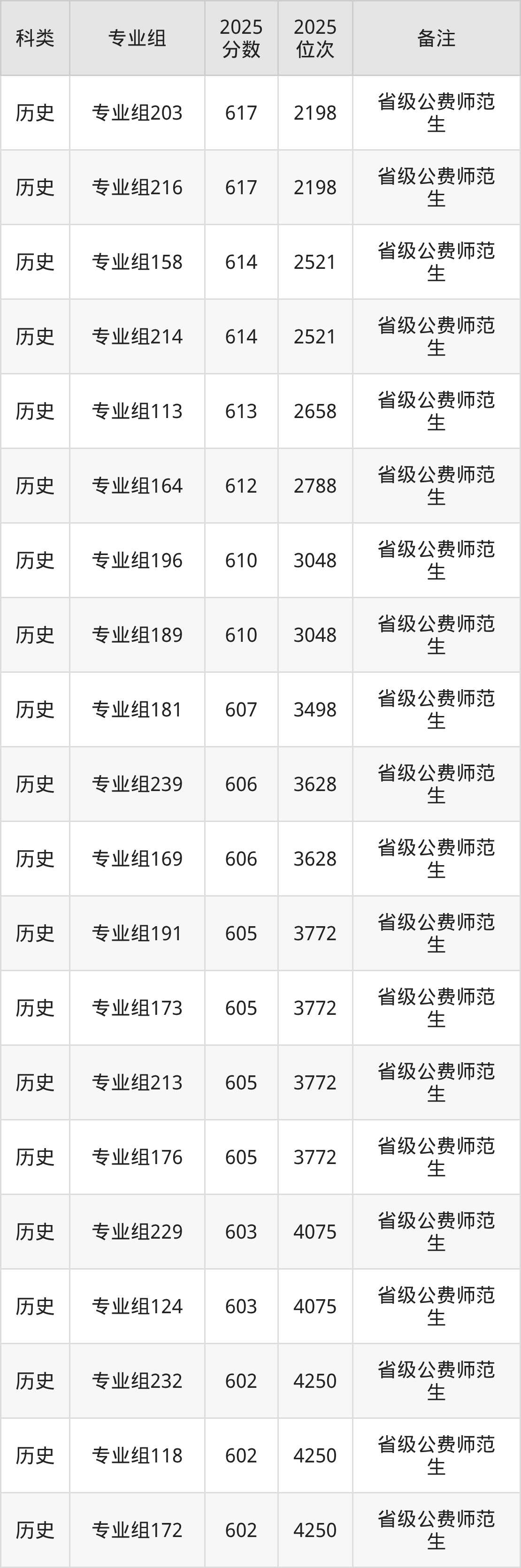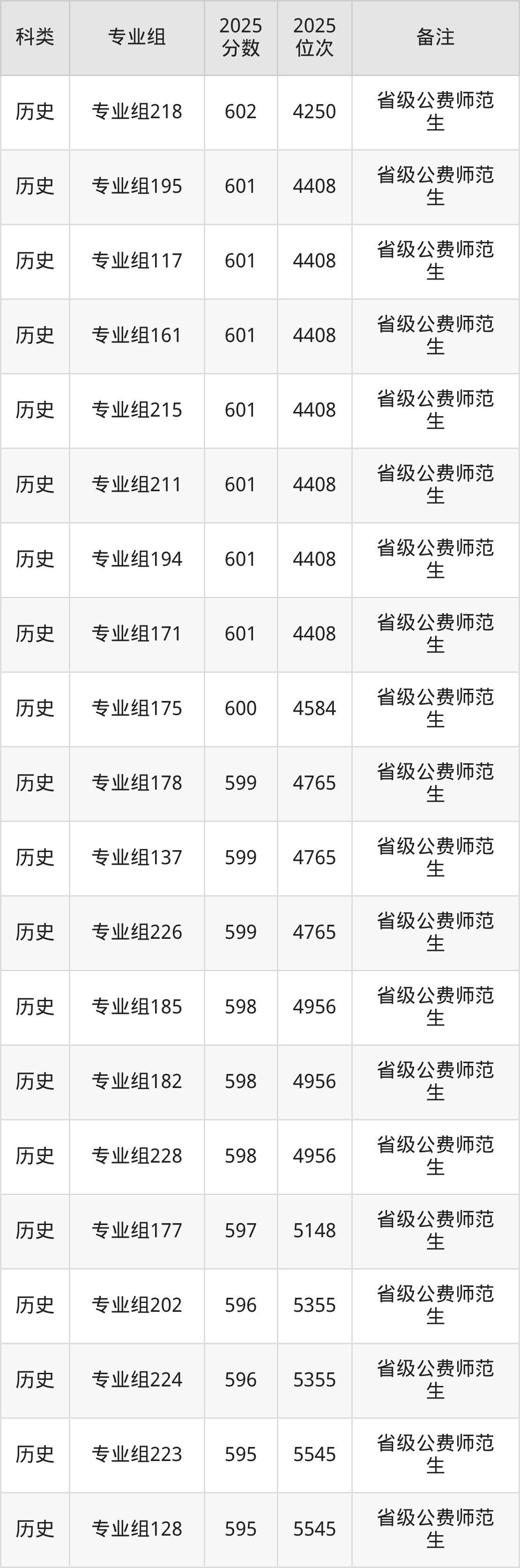 历史+地理:专业组206(省级公费师范生)541分、位次24236名;专业组207(省级公费师范生)579分、位次9420名;专业组208(省级公费师范生)578分、位次9693名;专业组209(省级公费师范生)586分、位次7556名;专业组210(省级公费师范生)583分、位次8332名等。