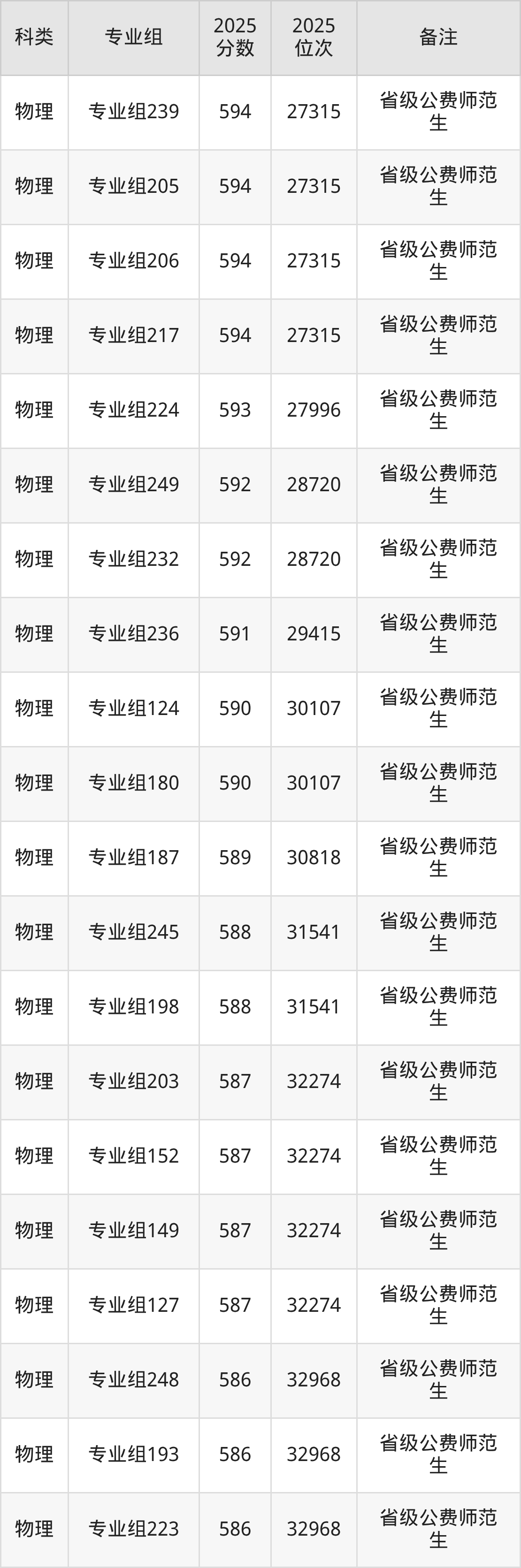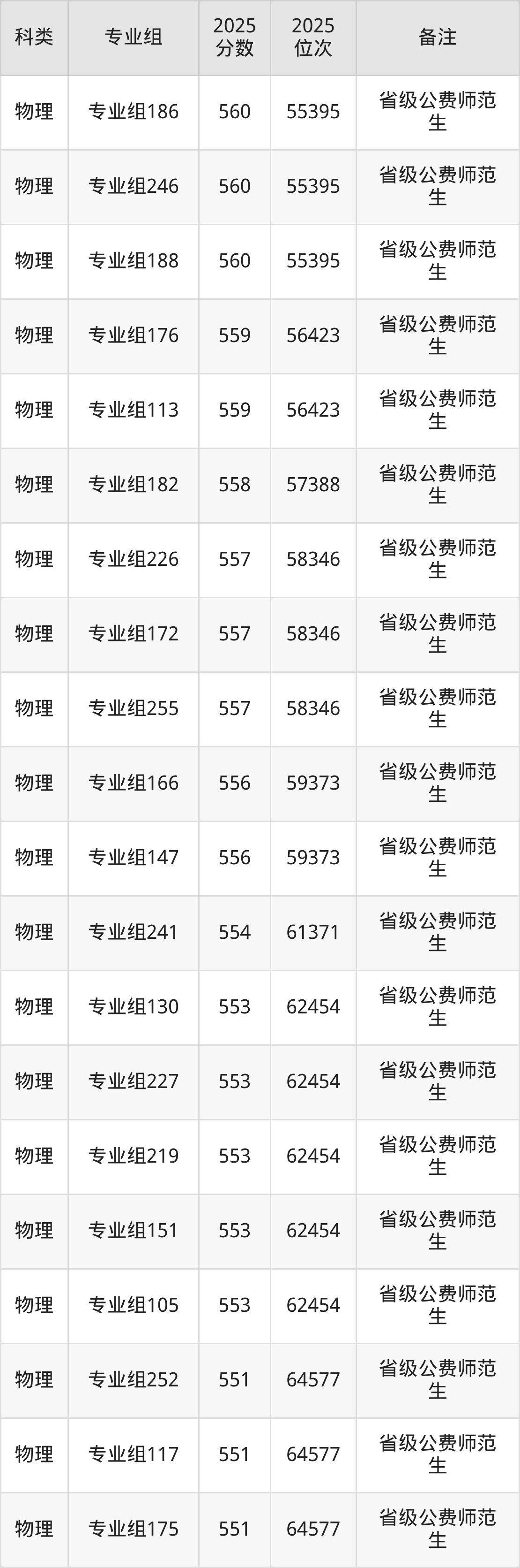 物理+化学:专业组186(省级公费师范生)560分、位次55395名;专业组187(省级公费师范生)589分、位次30818名;专业组188(省级公费师范生)560分、位次55395名;专业组189(省级公费师范生)569分、位次46766名;专业组190(省级公费师范生)562分、位次53398名等。