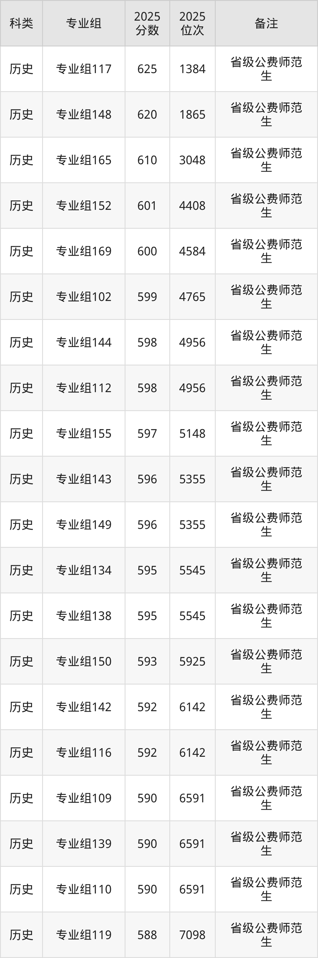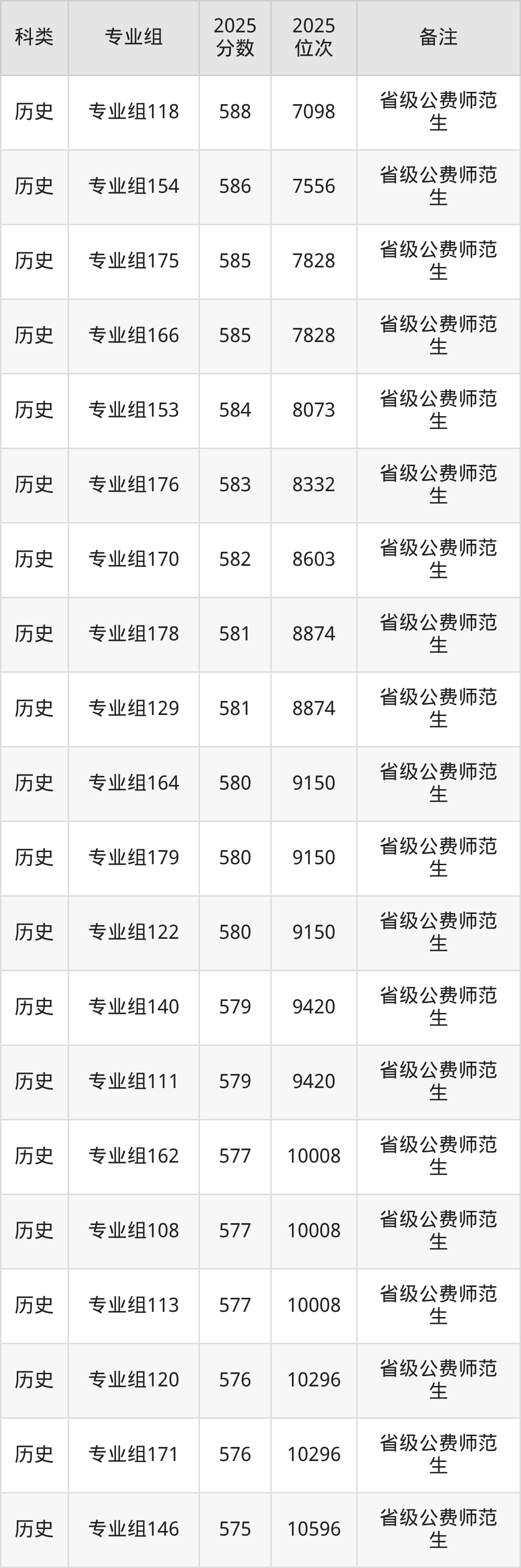 历史+政治:专业组144(省级公费师范生)589分、位次6830名;专业组145(省级公费师范生)580分、位次9150名;专业组146(省级公费师范生)575分、位次10596名;专业组147(省级公费师范生)569分、位次12520名;专业组148(省级公费师范生)563分、位次14706名等。
