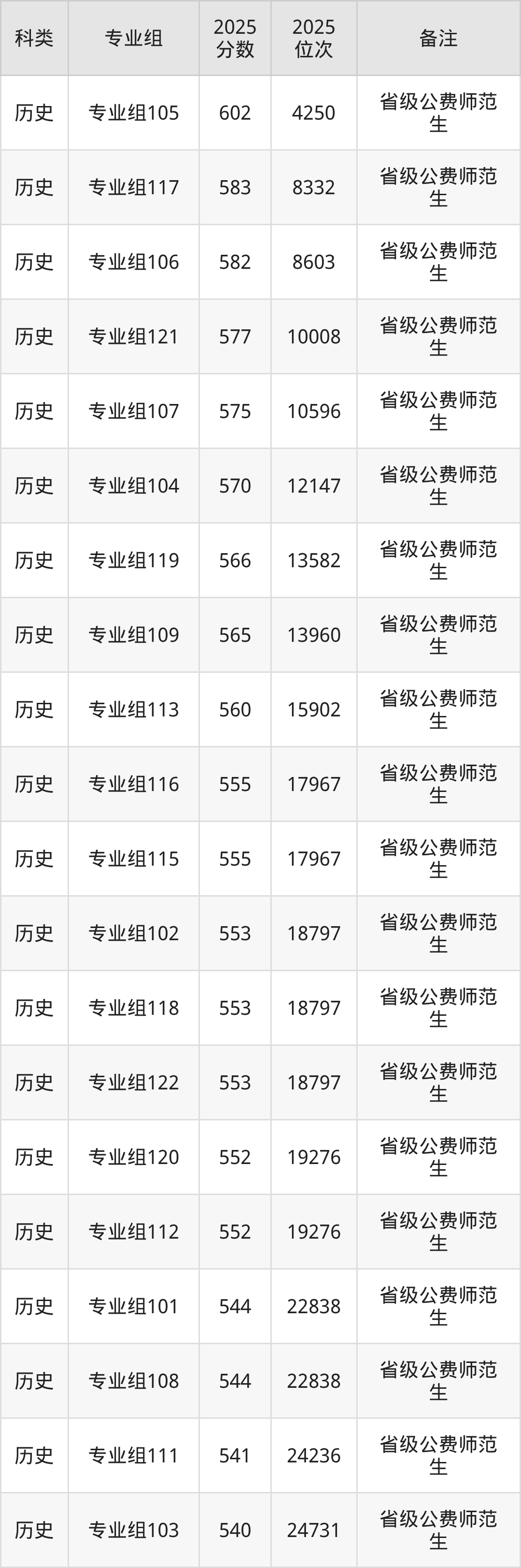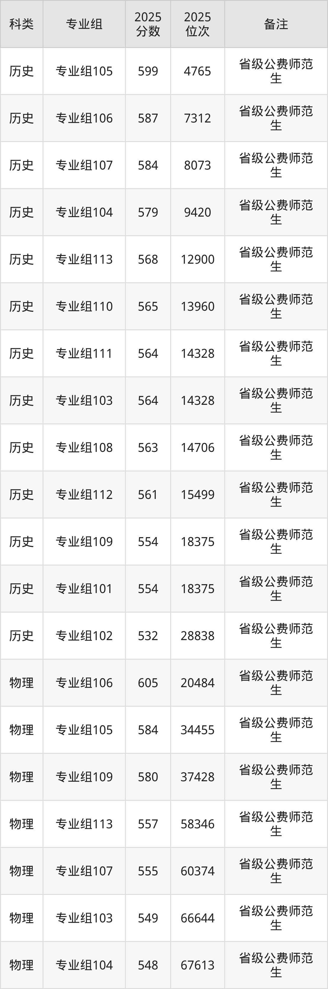 历史+不限:专业组101(省级公费师范生)最低534分(位次27829名);专业组102(省级公费师范生)最低599分(位次4765名);专业组103(省级公费师范生)最低571分(位次11819名);专业组104(省级公费师范生)最低568分(位次12900名);专业组105(省级公费师范生)最低568分(位次12900名)等。
