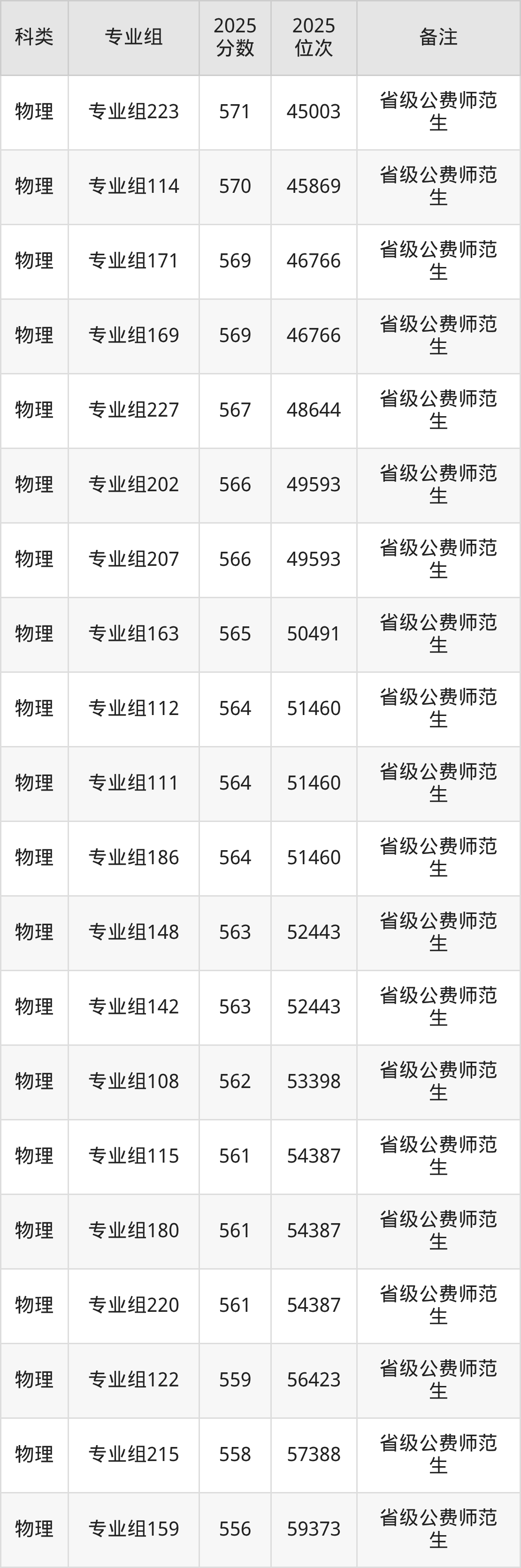 物理+化学+生物:专业组225(省级公费师范生)580分、位次37428名;专业组226(省级公费师范生)557分、位次58346名;专业组227(省级公费师范生)553分、位次62454名;专业组228(省级公费师范生)539分、位次77689名;专业组229(省级公费师范生)562分、位次53398名等。