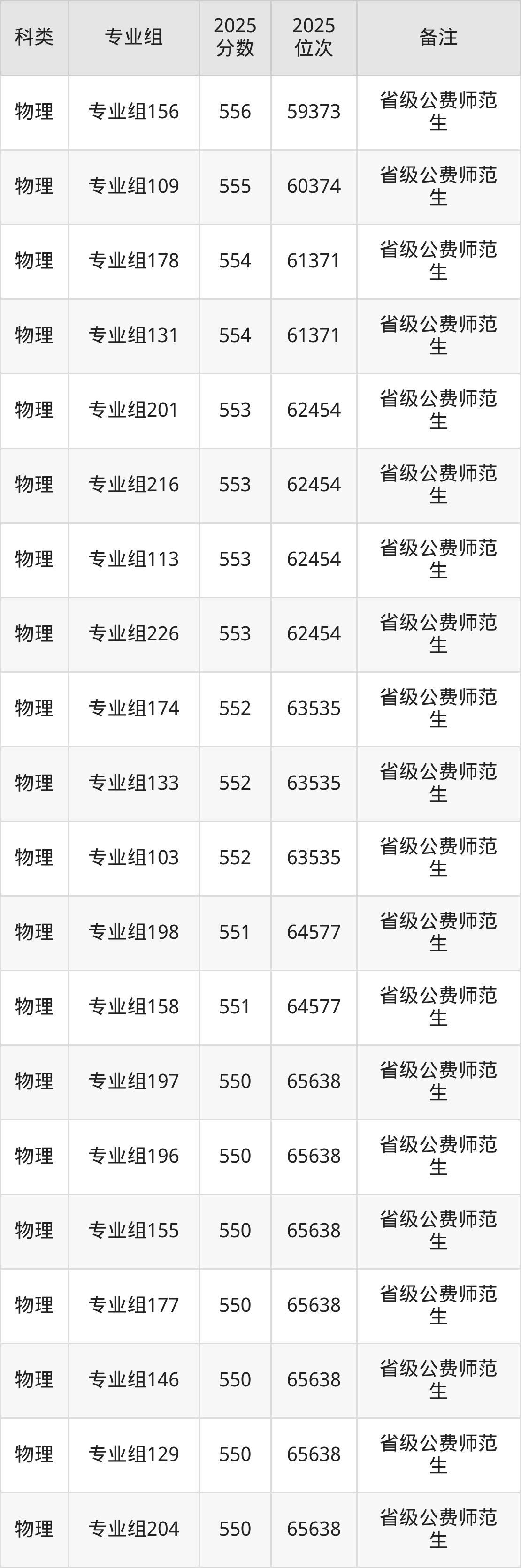 物理+化学:专业组129(省级公费师范生)最低550分(位次65638名);专业组130(省级公费师范生)最低495分(位次134050名);专业组131(省级公费师范生)最低554分(位次61371名);专业组132(省级公费师范生)最低545分(位次70843名);专业组133(省级公费师范生)最低552分(位次63535名)等。