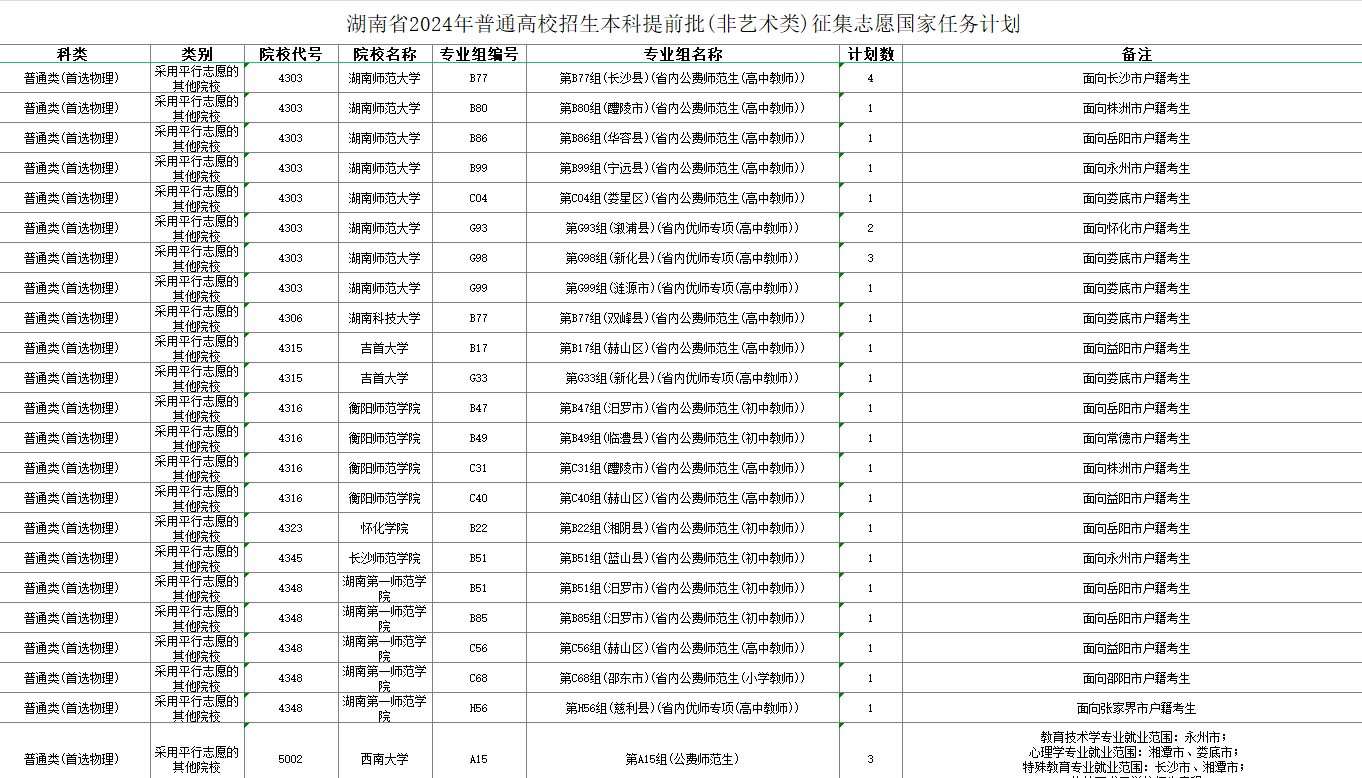 湖南省2024年普通高校招生本科提前批(非艺术类)征集志愿国家任务计划