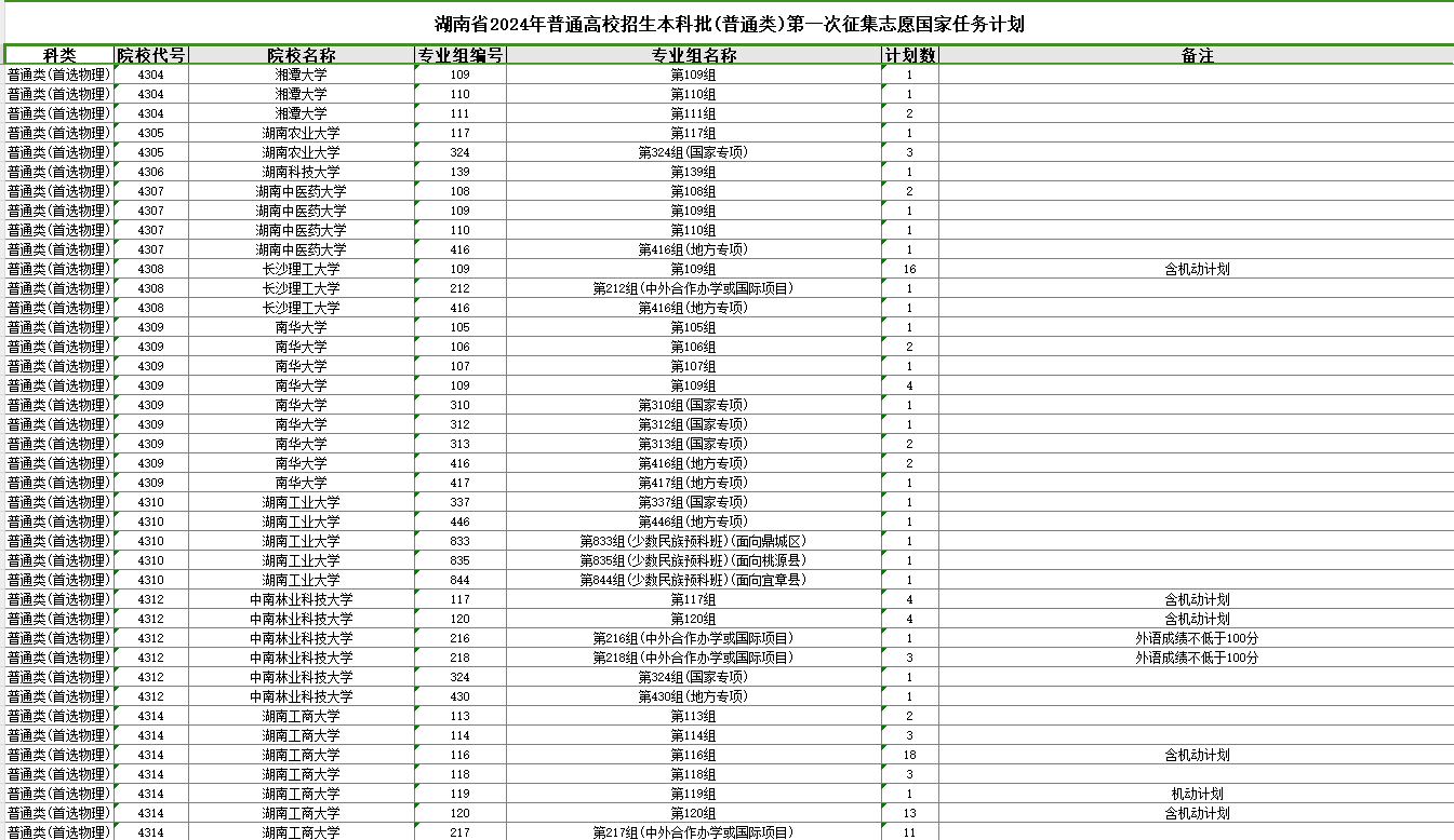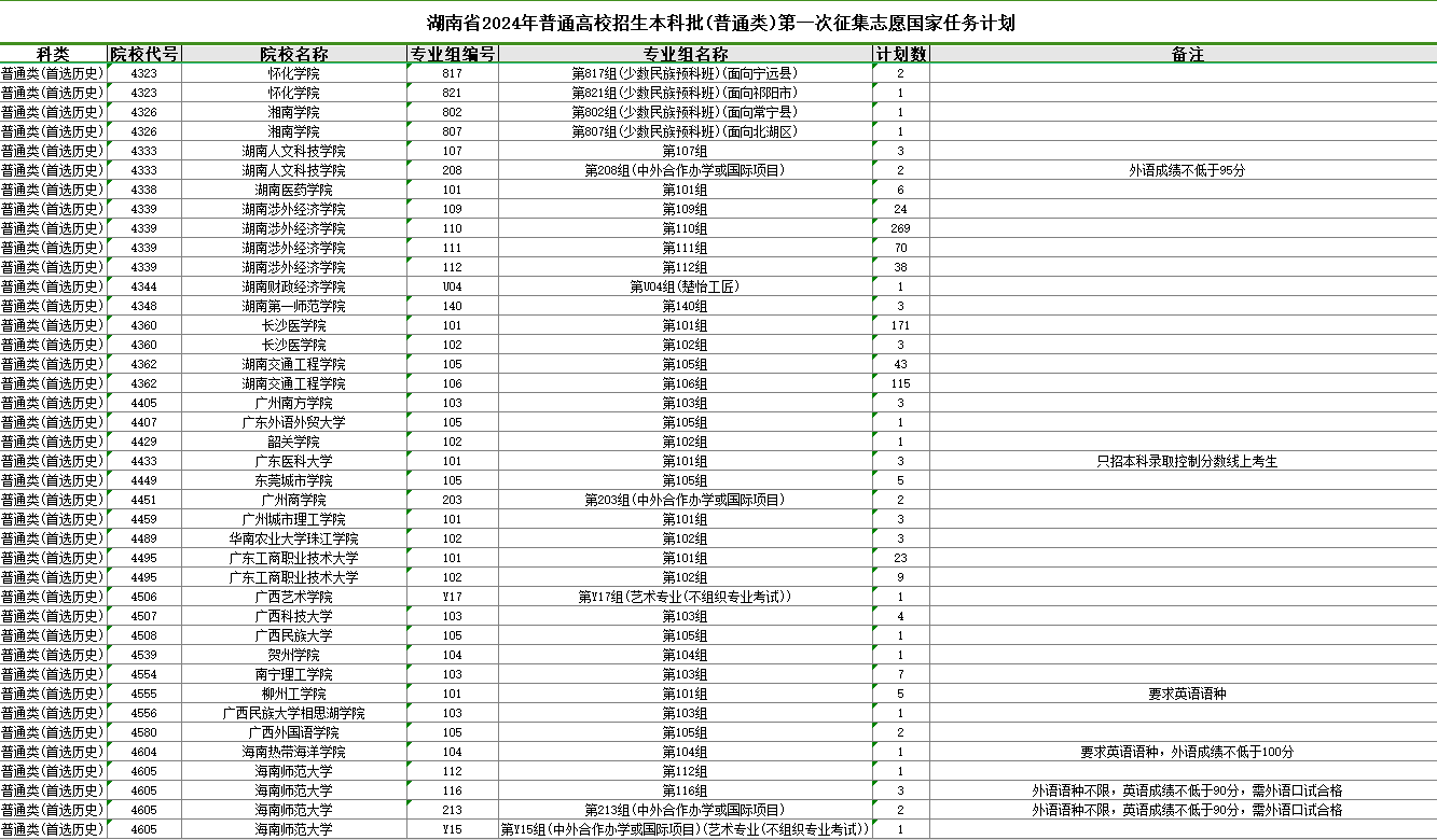 湖南省2024年普通高校招生本科批(普通类)第一次征集志愿国家任务计划