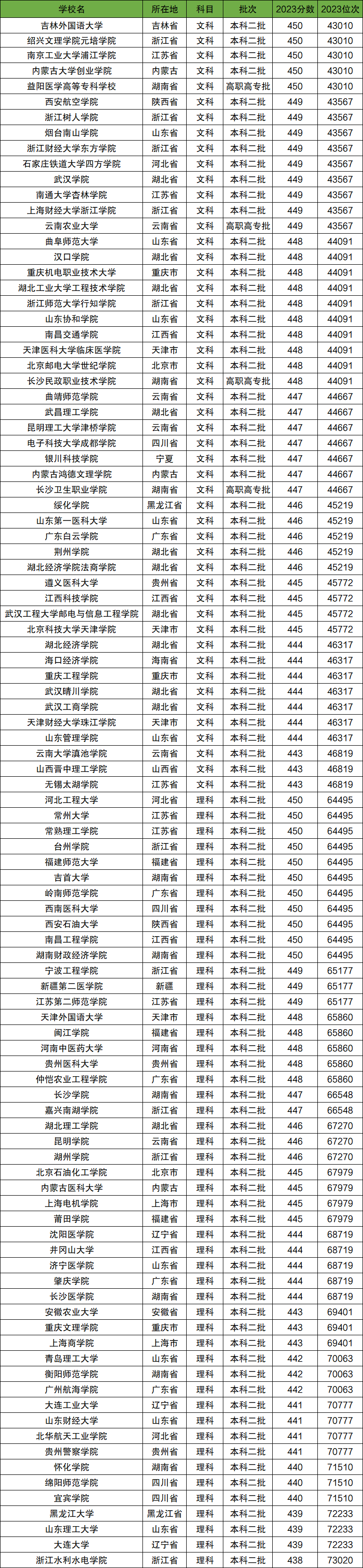 以下为2023年在广西壮族自治区400到450分的全国大学名单(广西壮族自治区以外)。