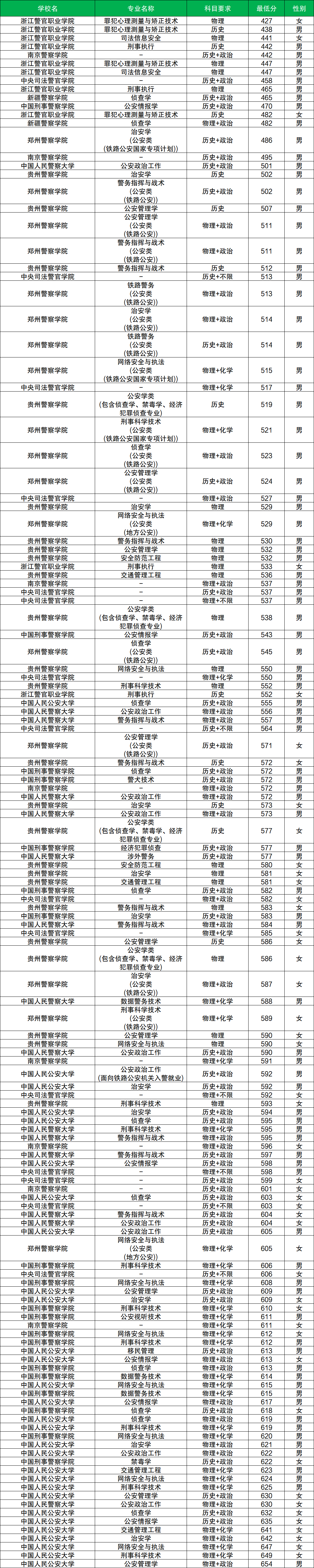其中物理类男生分数至少在480分及以上、女生分数至少在534分及以上才有机会被录取。而物理类男生分数最低的院校是中国刑事警察学院(专业代码:507),物理类女生分数最低的院校是浙江警官职业学院(专业代码:504)。