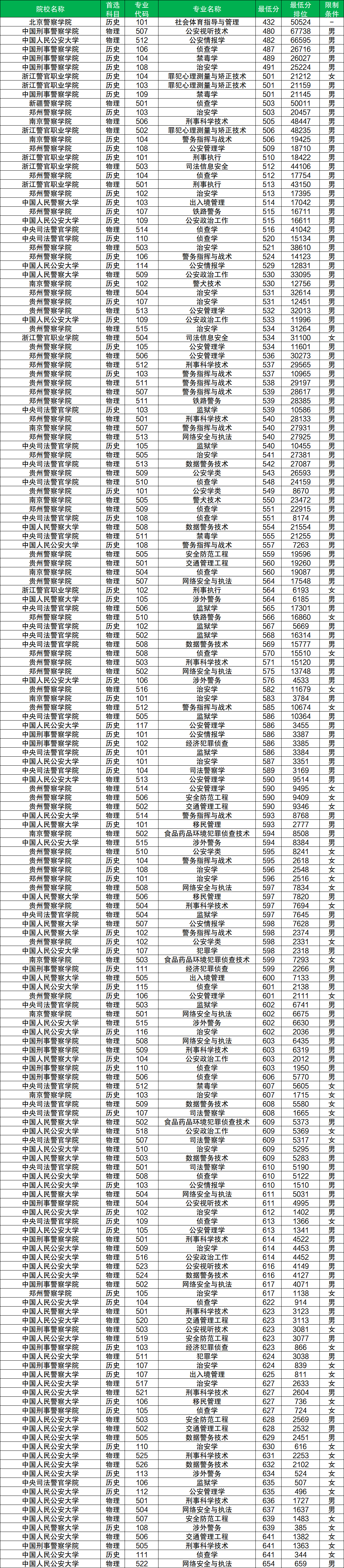 历史类男生分数至少在487分及以上、女生分数至少在501分及以上才有机会被录取。而历史类男生分数最低的院校是中国刑事警察学院(专业代码:106),历史类女生分数最低的院校是浙江警官职业学院(专业代码:104)。